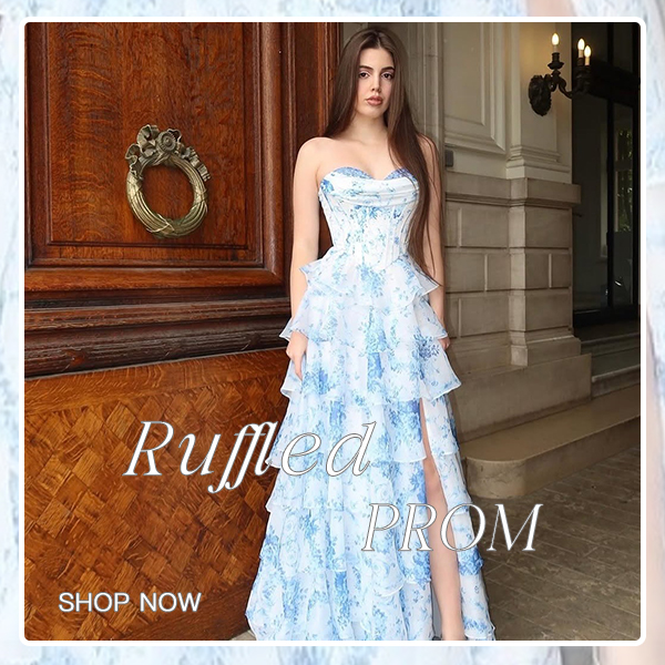 White Blue Flower A-Line Sweetheart Corset Ruffles Long Prom Dress with Slit