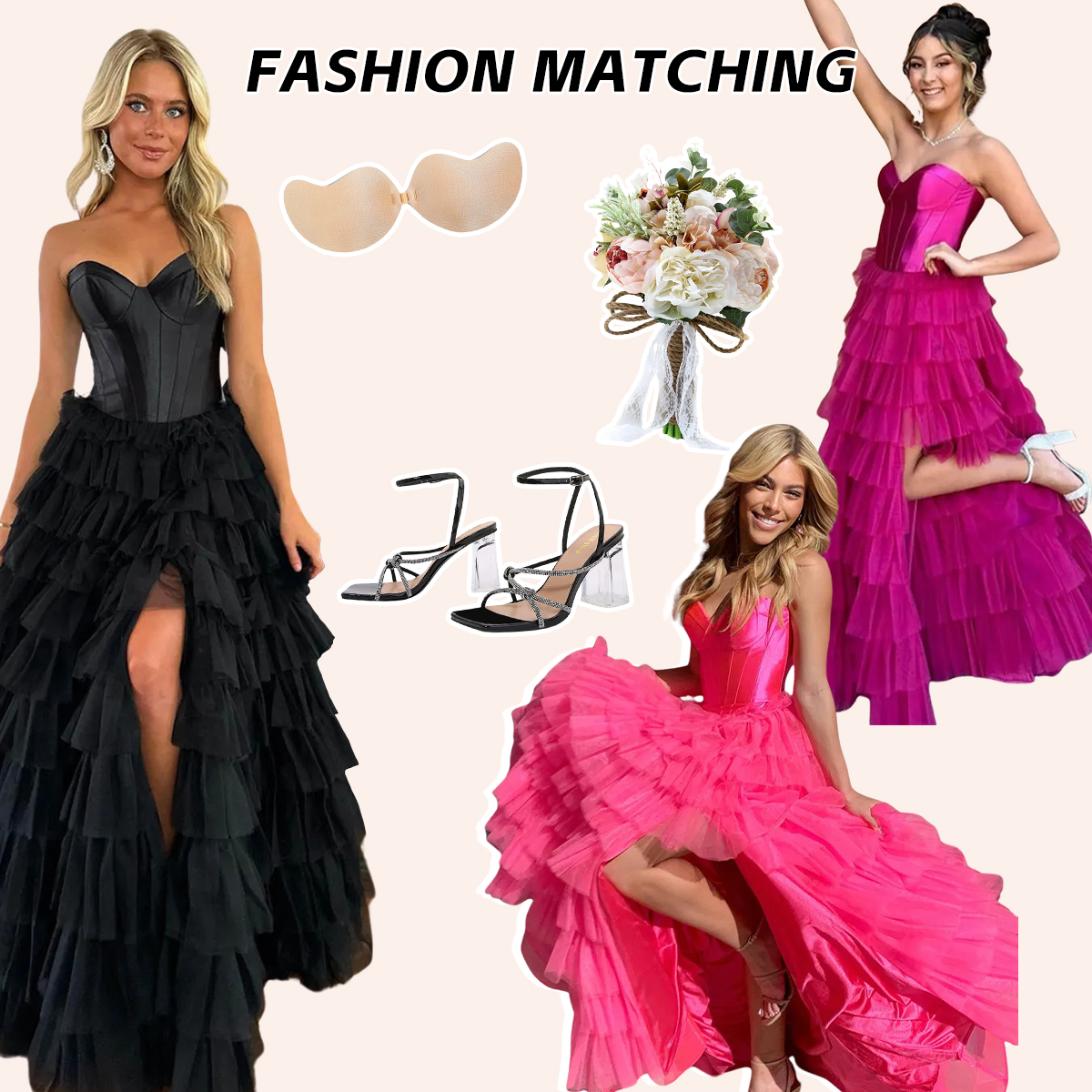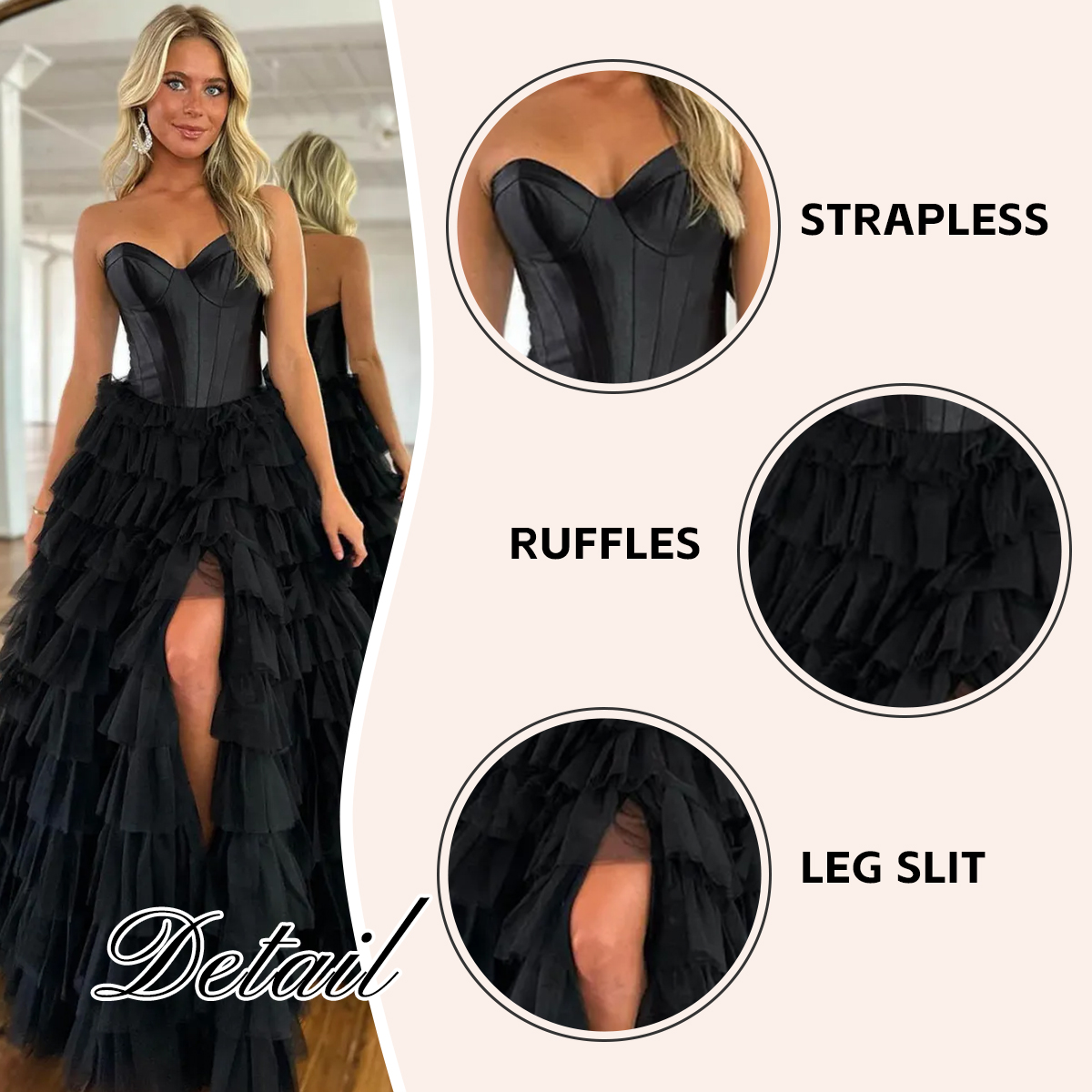 | OCCASION: | This A-Line Sweetheart Black Long Ruffle Tulle Prom Dress combines elegance and style effortlessly. With a sweetheart strapless neckline and a flattering A-line silhouette, this dress is designed to enhance your figure. The corset top bodice ensures a perfect fit and the tiered ruffles at the hemline add a touch of sophistication. The high leg slit adds a hint of sexiness to this stunning prom dress. Available in Fuchsia and various sizes, including Custom Size, this dress is perfect for any formal occasion. |