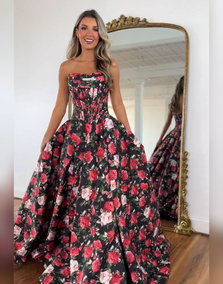 Black and Red Floral A Line Corset Strapless Long Satin Prom Dress with Slit