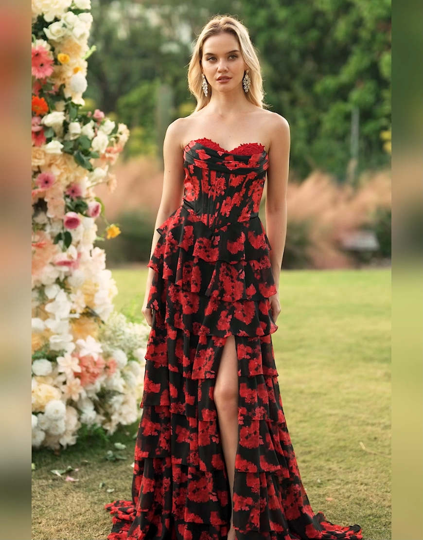Occasion: Make a dramatic and high-fashion entrance in this Black and Red Floral Corset Tiered Long Prom Dress. This show-stopping gown features a structured corset bodice with a romantic sweetheart neckline and sophisticated ruched detailing. The design is beautifully contrasted by a bold red floral print set against a sleek black background. The voluminous A-line silhouette is crafted from layers of airy fabric, featuring a striking tiered ruffled design that adds movement and grandeur. A daring thigh-high side slit is seamlessly integrated into the ruffled skirt, providing a modern touch of allure. Ideal for prom, formal galas, or luxury evening events, this ensemble perfectly balances edgy architectural structure with classic floral elegance.