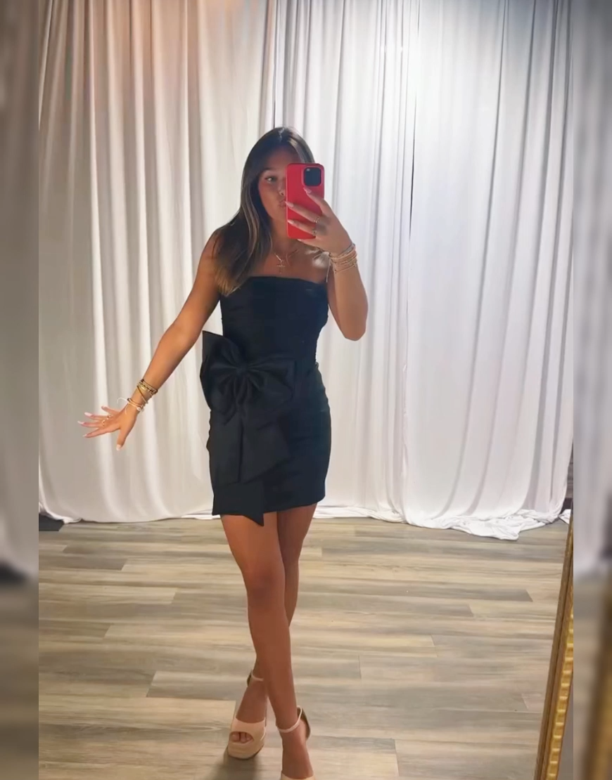 Description: Achieve effortless sophistication in the Berlinnova Women Black Satin Tight Short Homecoming Dress. This sleek and form-fitting silhouette is designed to hug your curves, offering a chic, timeless look. The bodice features a flattering Strapless neckline, elegantly accented with a playful Bow detail. Crafted from luxurious Black Satin fabric, this stunning Tight Short dress is the perfect choice for a glamorous Cocktail Dress or a stylish Homecoming party.