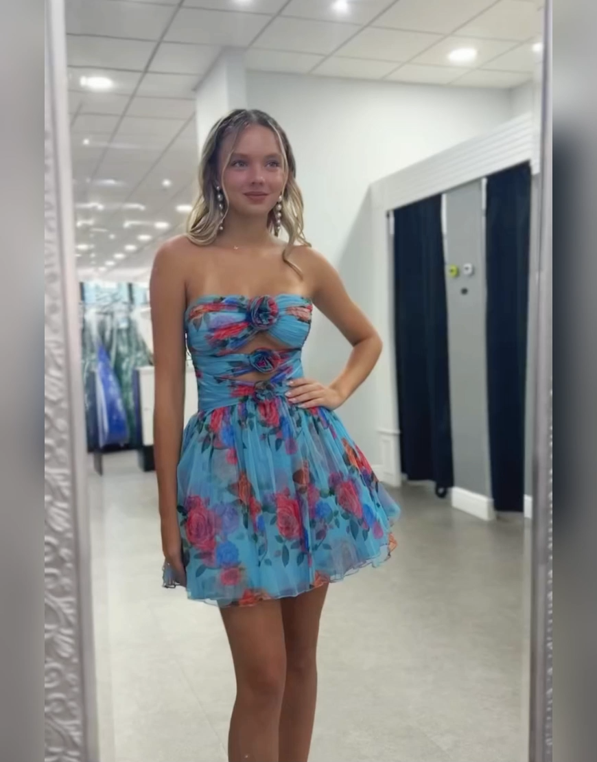 Occasion: Blue Floral A Line Chiffon Keyhole Short Homecoming Dress is crafted from lightweight chiffon, featuring a strapless design. It’s adorned with vibrant floral prints, adding a lively and romantic touch. The bodice incorporates a keyhole cutout detail, enhancing its allure, while the flared skirt creates a playful silhouette. Whether you're heading to homecoming, school events, parties, or a fun night out, this dress brings elegance, confidence, and a touch of sparkle to your look.
