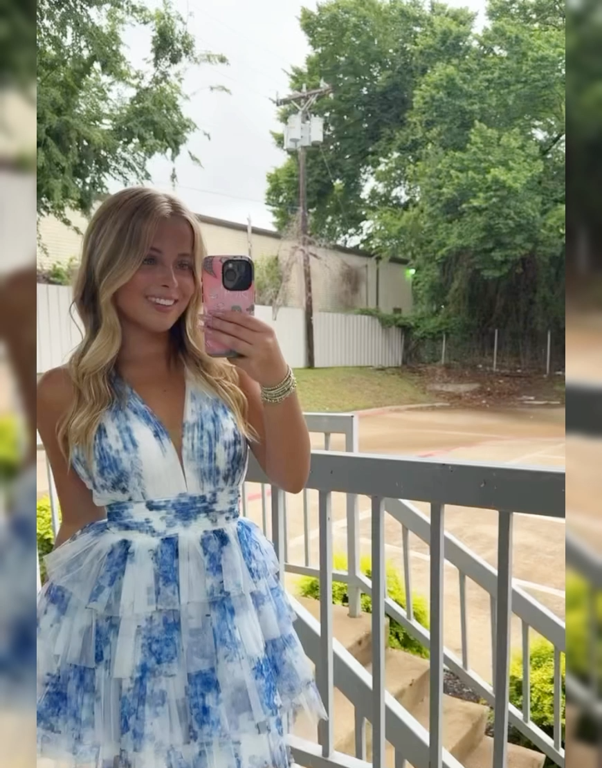 Blue Flower A-Line Tulle Halter Tiered Short Homecoming Dress
