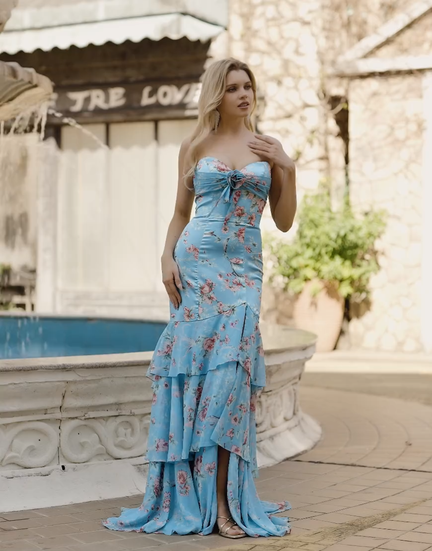 Blue Pink Floral Sweetheart Mermaid Long Prom Dress with Ruffles