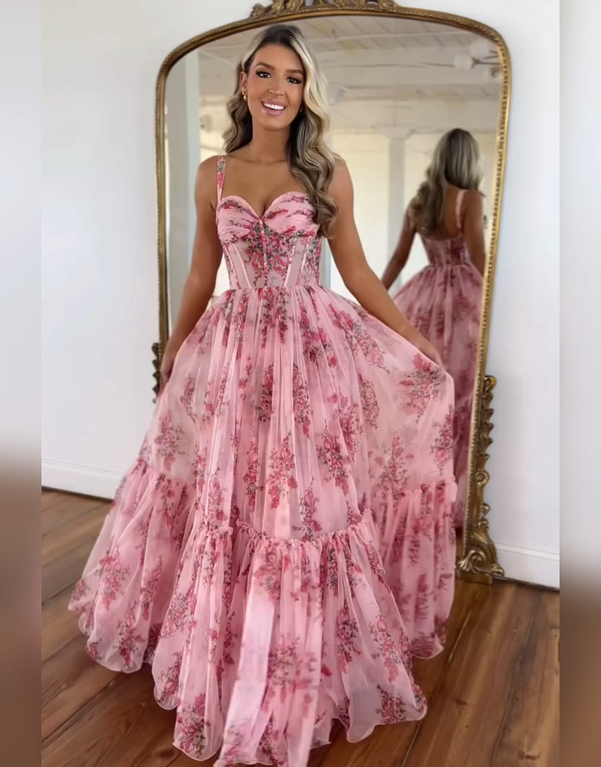 | OCCASION: | Exude fairytale charm in this Princess Blush Floral Prom Dress. This enchanting A-line gown features a delicate floral print on a structured corset bodice with supportive spaghetti straps. The voluminous tulle skirt is designed with romantic ruffled layers for a dreamy, whimsical silhouette. Ideal for prom, garden-themed galas, pageants, or formal spring weddings, this dress perfectly blends timeless elegance with a modern, romantic aesthetic. |