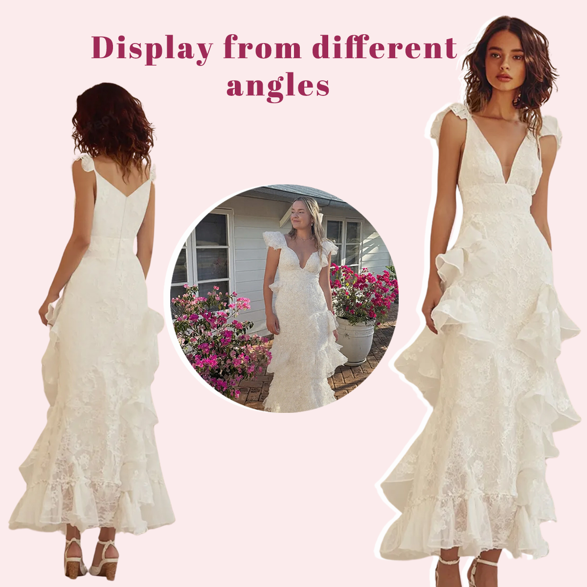 This dress is the perfect blend of elegance and romance. Designed with a flattering deep V-neckline, it highlights your natural beauty while adding a touch of sophistication. The delicate lace fabric enhances its feminine charm, while the flowing maxi silhouette creates a graceful and ethereal look. Soft ruffles cascade down the skirt, adding movement and a dreamy feel with every step. The fitted bodice accentuates your curves, while the open-back design adds a hint of allure. Whether you’re celebrating your graduation, attending a special event, or capturing timeless photos, this dress is a stunning choice. Perfect for graduations, weddings, or special events. Available in a range of sizes, including custom options. Whether you are dressing it for a wedding party, prom, evening party, or any other occasion, this party dress will be your lovely partner. |