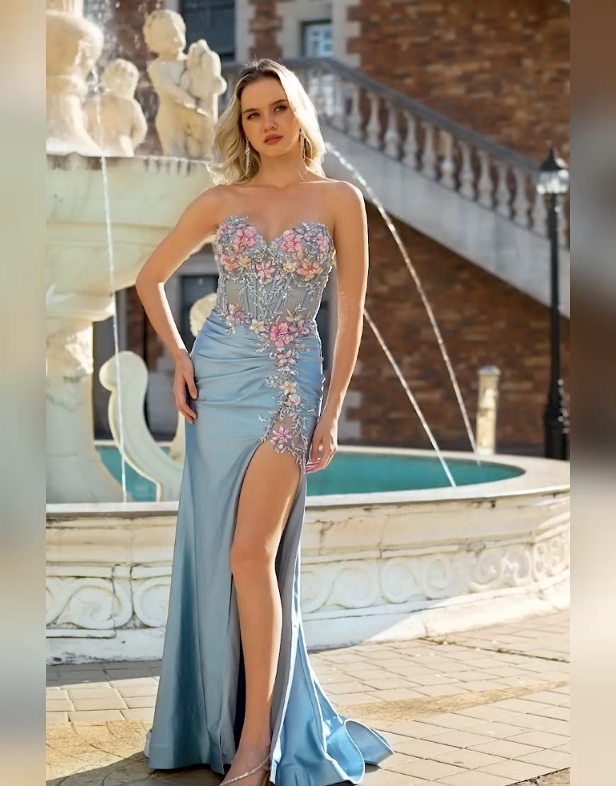 Floral Grey Blue Mermaid Ruched Long Corset Satin Prom Dress with Slit
