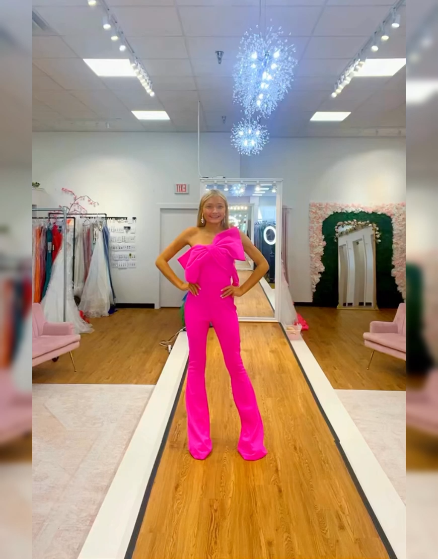 Fuchsia Strapless Tight Satin Long Homecoming Jumpsuits with Bow