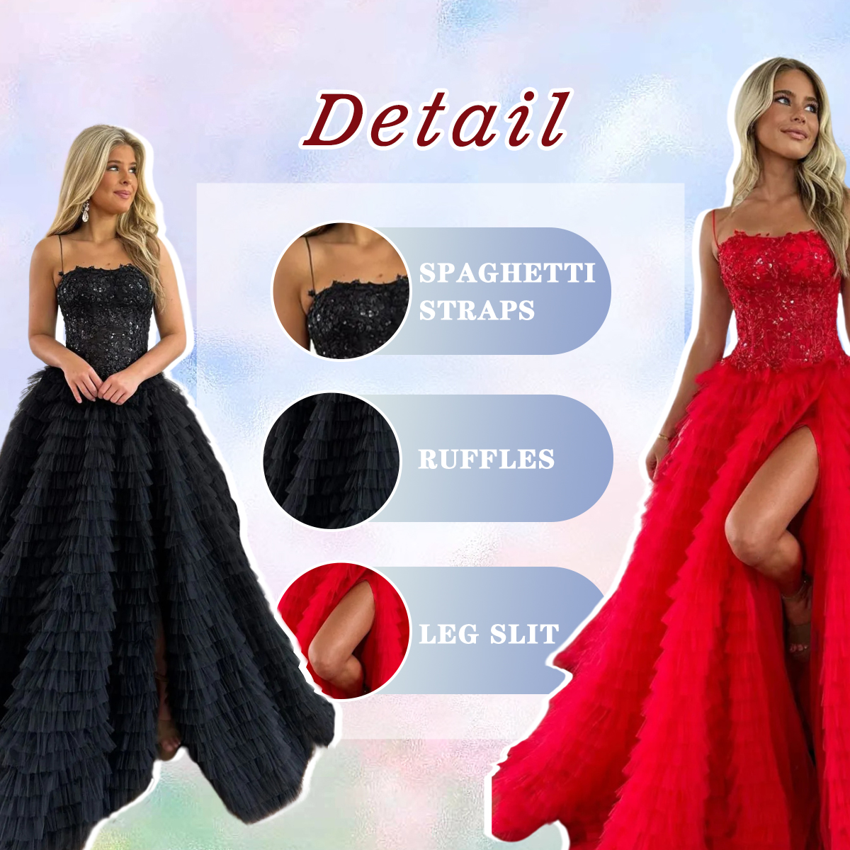 Achieve dramatic elegance in the Berlinnova Women Sparkly Black Tiered Long Tulle Prom Dress. This magnificent A-Line Ball Gown silhouette features voluminous Tiered layers of soft Tulle and delicate Ruffles, creating enchanting movement. The bodice is beautifully crafted with glittering Sequined and Lace fabric, supported by delicate Spaghetti Straps. The gown features a daring high Slit and is infused with an overall Sparkly finish in classic Black. Whether you are dressing it for a wedding party, prom, evening party, pageant, gala, military ball or any other occasion, this party dress will be your lovely partner. |