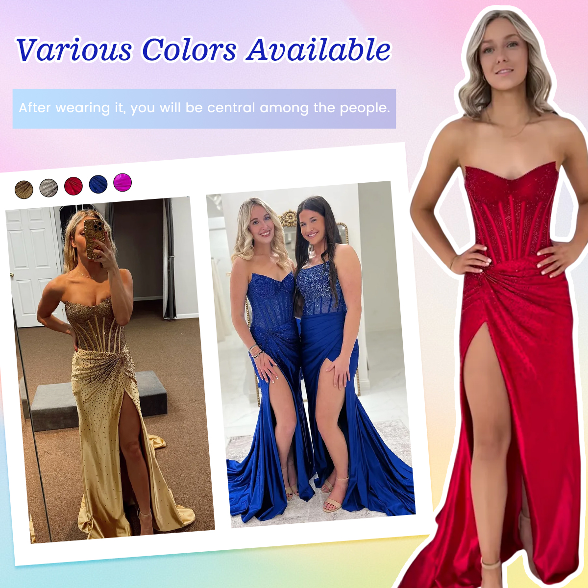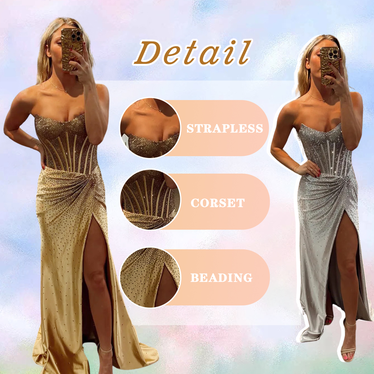 | OCCASION: | Capture the glamour as you walk on this stunning gorgeous prom dress. You will look amazing for the party in this attire which features an alluring strapless neckline on a figure-flattering bodice. The beaded top reveals a mid-open back, while the glittery mermaid skirt showcases an enticing high slit down to the floor length. It also exhibits a beautiful corset waist, elevating the overall appeal of this creation. Enhance your visual appeal in this luxurious masterpiece. Choose from a range of colors and sizes for a perfect fit. Perfect for occasions like proms, parties, evenings, gala, pageants, or any formal events. |