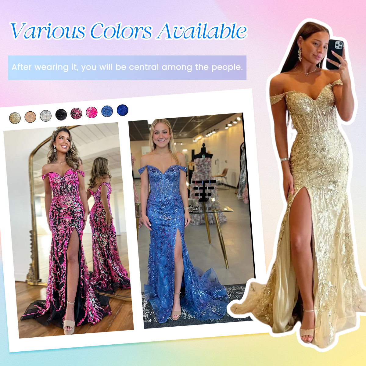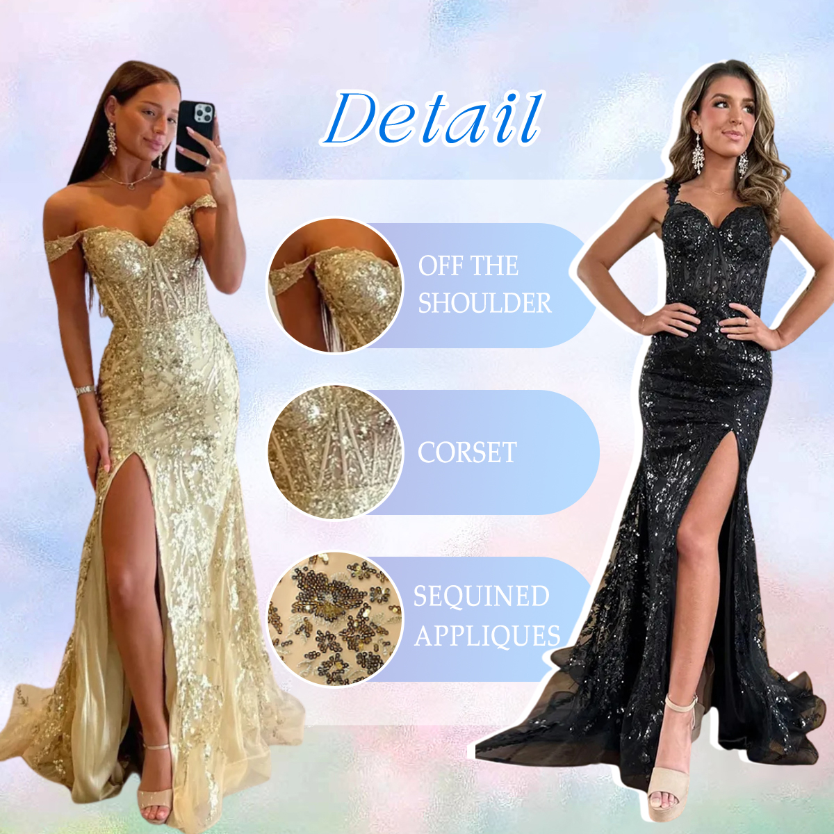 Radiate pure luxury in this Sparkly Golden Corset Long Prom Dress with Slit Mermaid Off the Shoulder Sequin Dress, a true masterpiece for high-end celebrations. The gown features a meticulously structured corset bodice with sheer panels and elegant off-the-shoulder straps that perfectly frame the neckline. Dazzling gold sequins create an intricate shimmering pattern across the mermaid silhouette, flowing into a graceful floor-length skirt. A daring high side slit adds a modern, red-carpet edge, while the lace-up back ensures a flawless, custom fit that highlights your curves. |