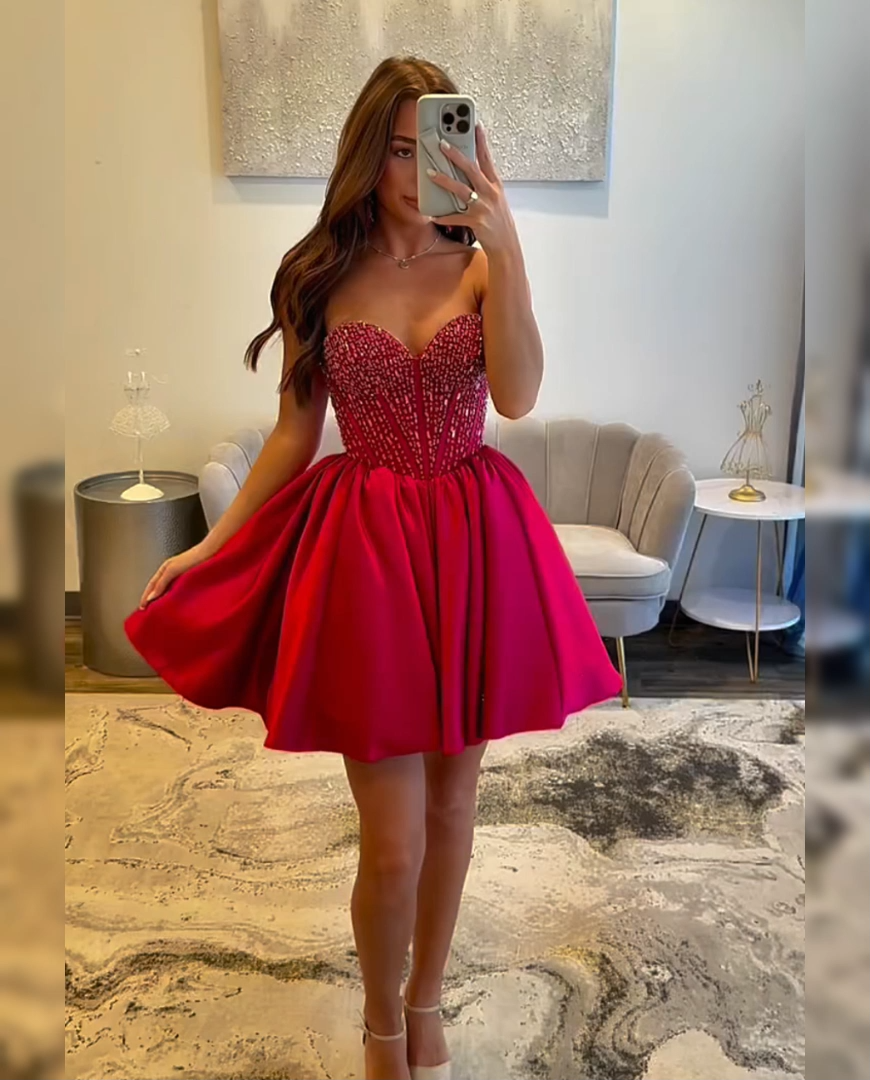 Glitter Red Sweetheart Satin A-Line Corset Homecoming Dress with Beading