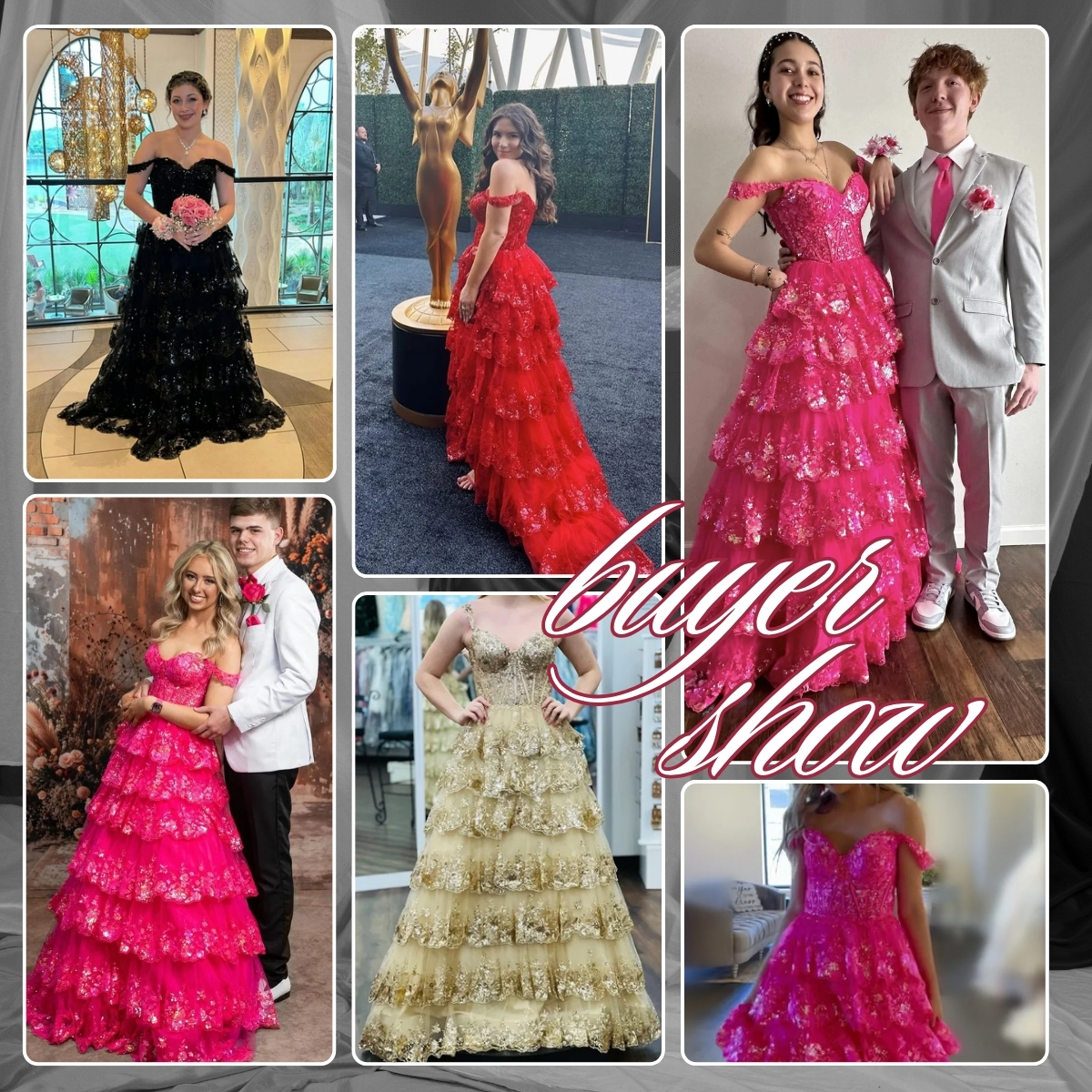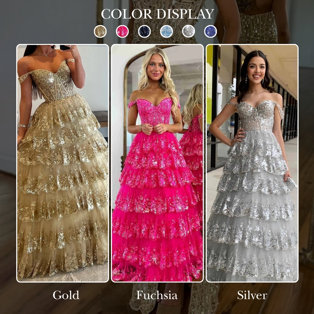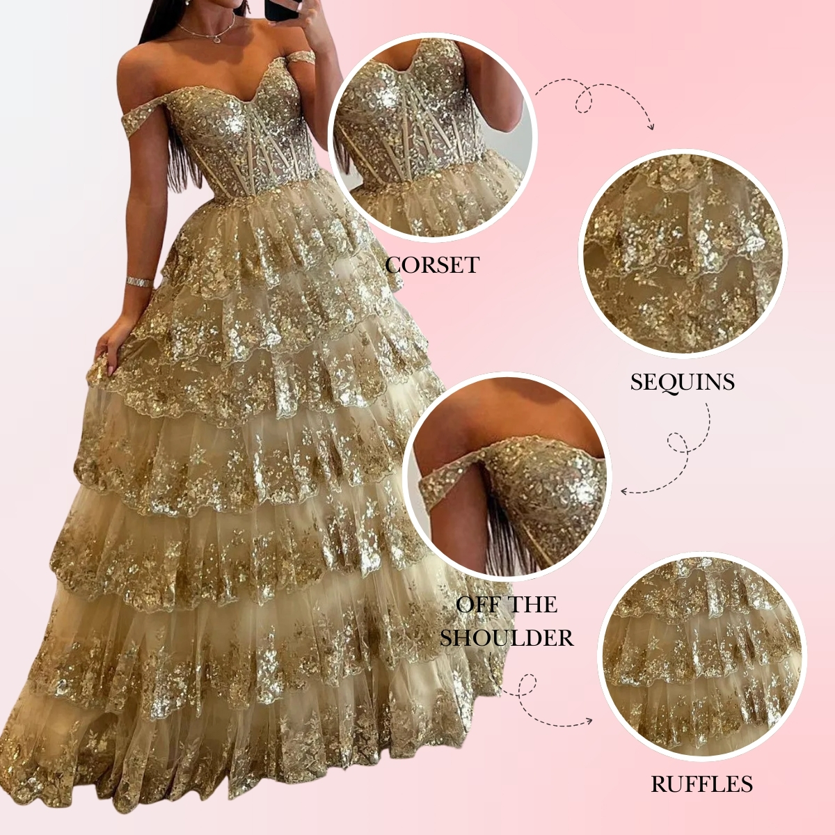 | OCCASION: | Make a radiant and high-fashion entrance in this Sparkly Fuchsia A-Line Off the Shoulder Long Prom Dress. This show-stopping gown features a structured corset bodice with visible vertical boning and a romantic sweetheart neckline, elegantly accented with shimmering sequins and lace appliqués for a brilliant, light-catching effect. The design is beautifully finished with delicate off-the-shoulder straps that drape gracefully over the arms. The voluminous A-line silhouette is crafted from layers of airy champagne tulle, featuring a dramatic tiered ruffled design entirely saturated with glittering golden sequins and intricate floral lace. The gown flows into a sweeping, floor-length finish, providing a perfect blend of modern architectural structure and classic princess-inspired glamour. Ideal for prom, pageants, or luxury formal galas, this fuchsia masterpiece ensures a sophisticated and unforgettable presence. |