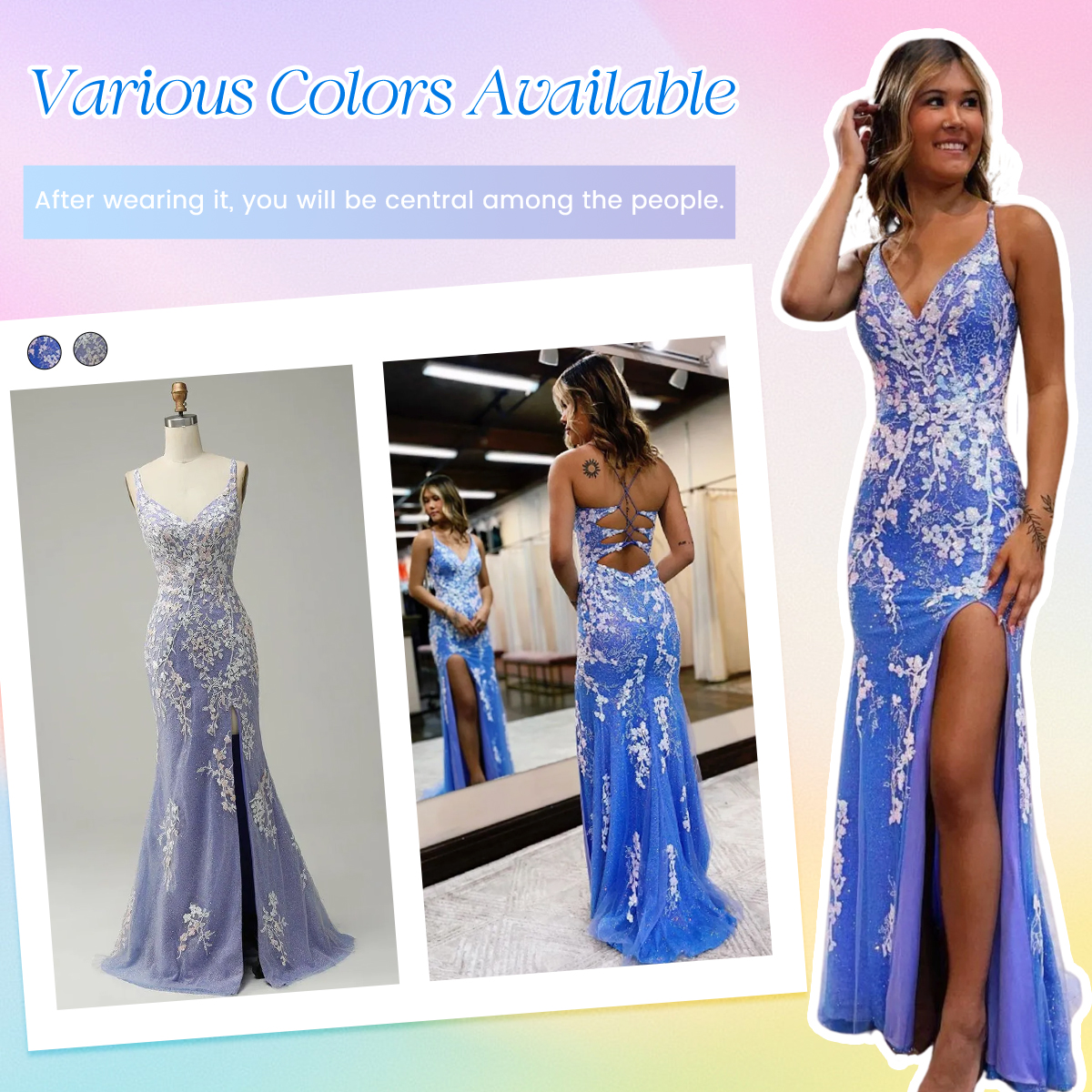 | OCCASION: | Make an enchanting entrance in this Glitter Blue Mermaid Prom Dress. This ethereal gown features a flattering V-neckline and delicate spaghetti straps that lead to a stunning criss-cross lace-up back. The figure-hugging silhouette is beautifully adorned with shimmering glitter and romantic white floral lace appliqués that trail down to a daring high slit. This dreamy look is ideal for prom, formal galas, pageants, or luxury evening events, offering a perfect blend of whimsical detail and sophisticated red-carpet glamour. |
