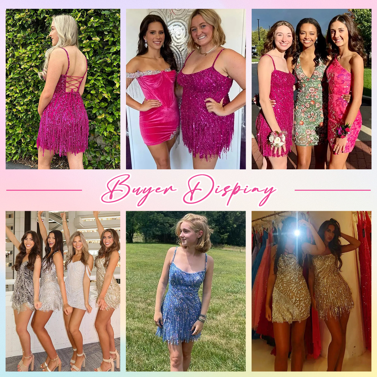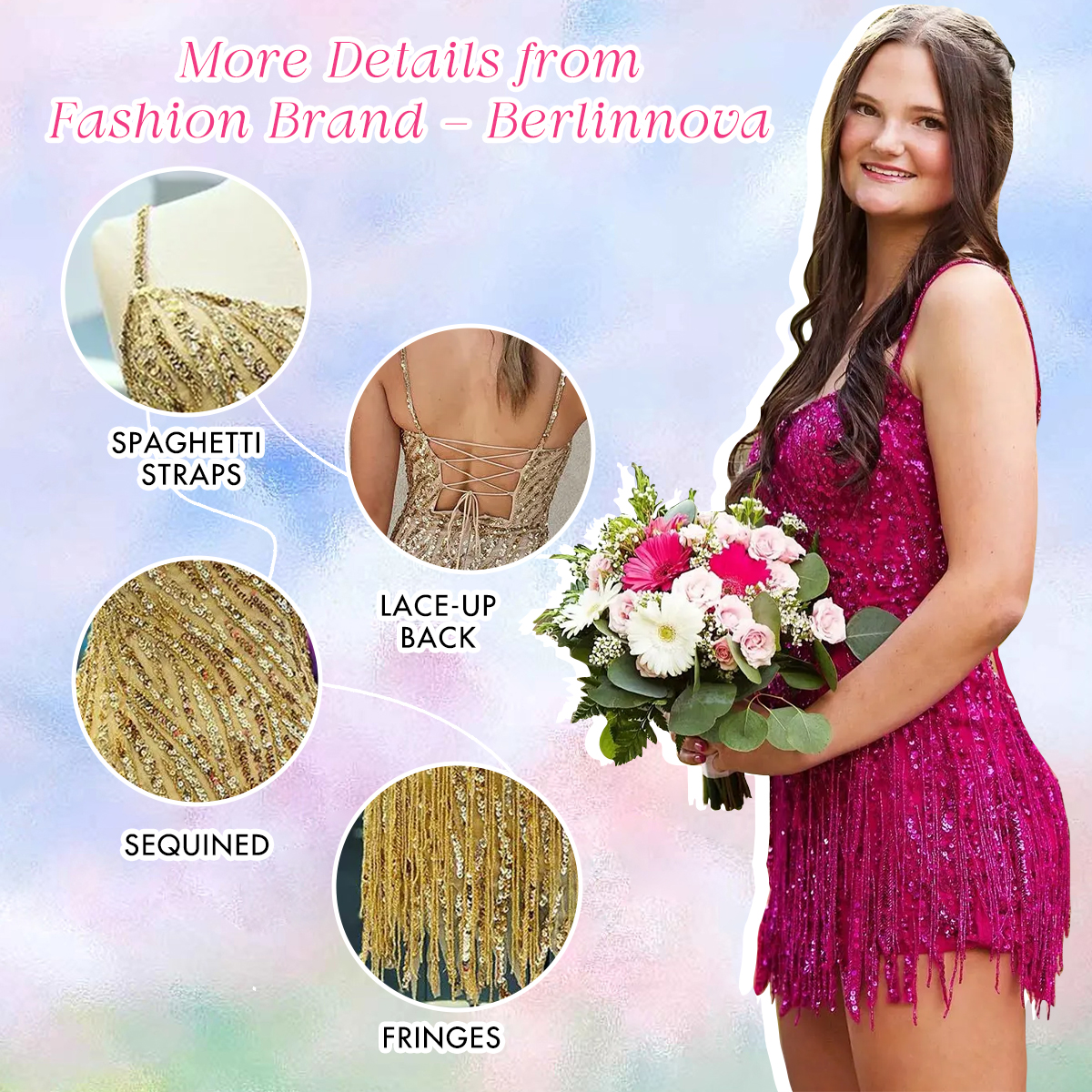 Steal the show in the Berlinnova Women Sparkly Gold Spaghetti Straps Short Homecoming Dress. This sleek Tight silhouette is designed to hug and flatter your figure, featuring dynamic Fringe detailing that dances beautifully with every step. The bodice is crafted from glittering Sequin fabric and supported by delicate Spaghetti Straps. |