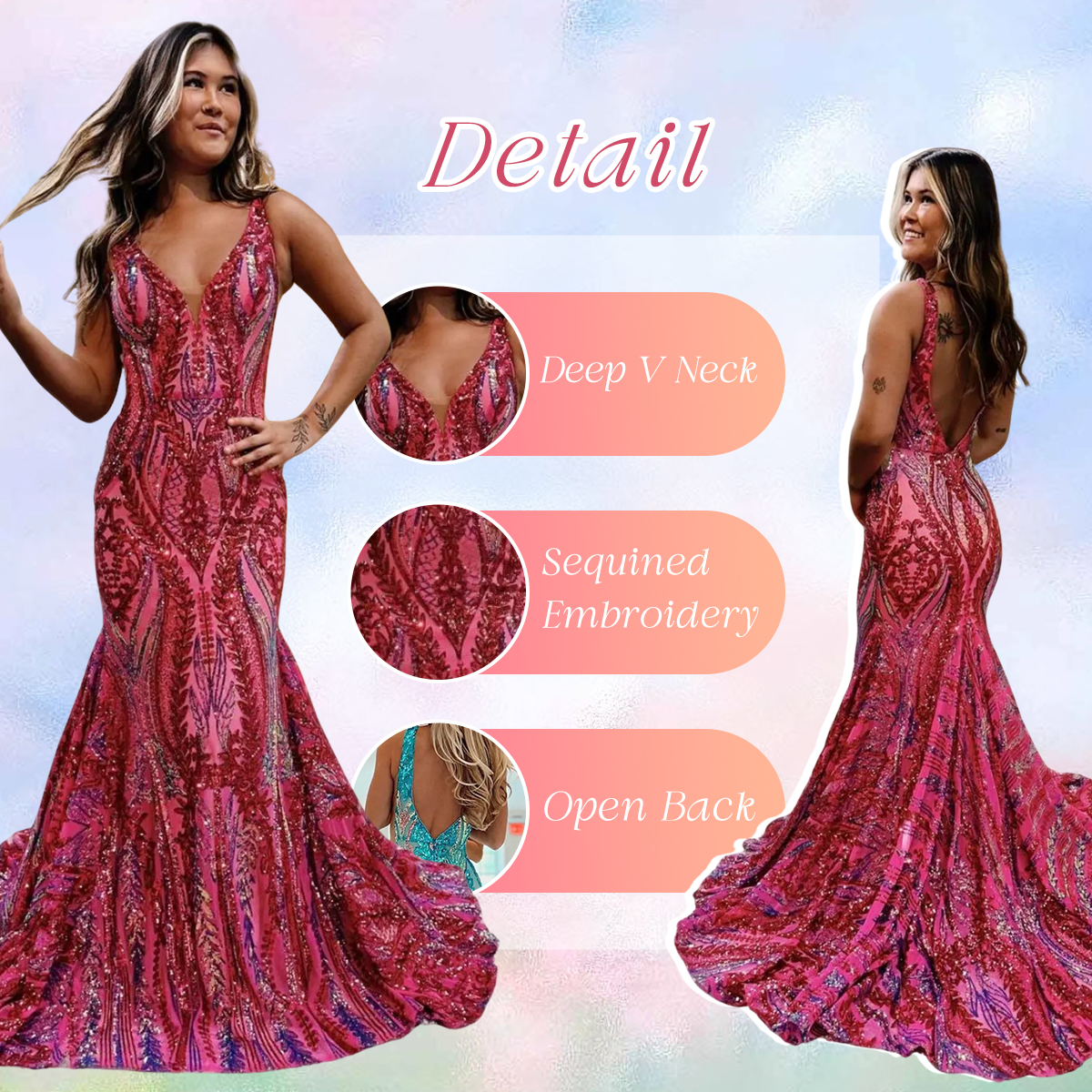 OCCASION: This Sexy V-Neck Sequins Prom Dress is an ideal way to make a statement for your formal occasions. With its sequins and open-back detail, you'll be sure to catch everyone's eye. The sweep train features a V-neck and an elegant look. This dress is sure to stun with the dramatic pattern, adding a touch of sophistication. Available in Fuchsia, Dark Purple, Purple, and various sizes, including Custom Size, make a statement in this enchanting dress. Perfect for proms, parties, evening party, gala and any formal occasions.