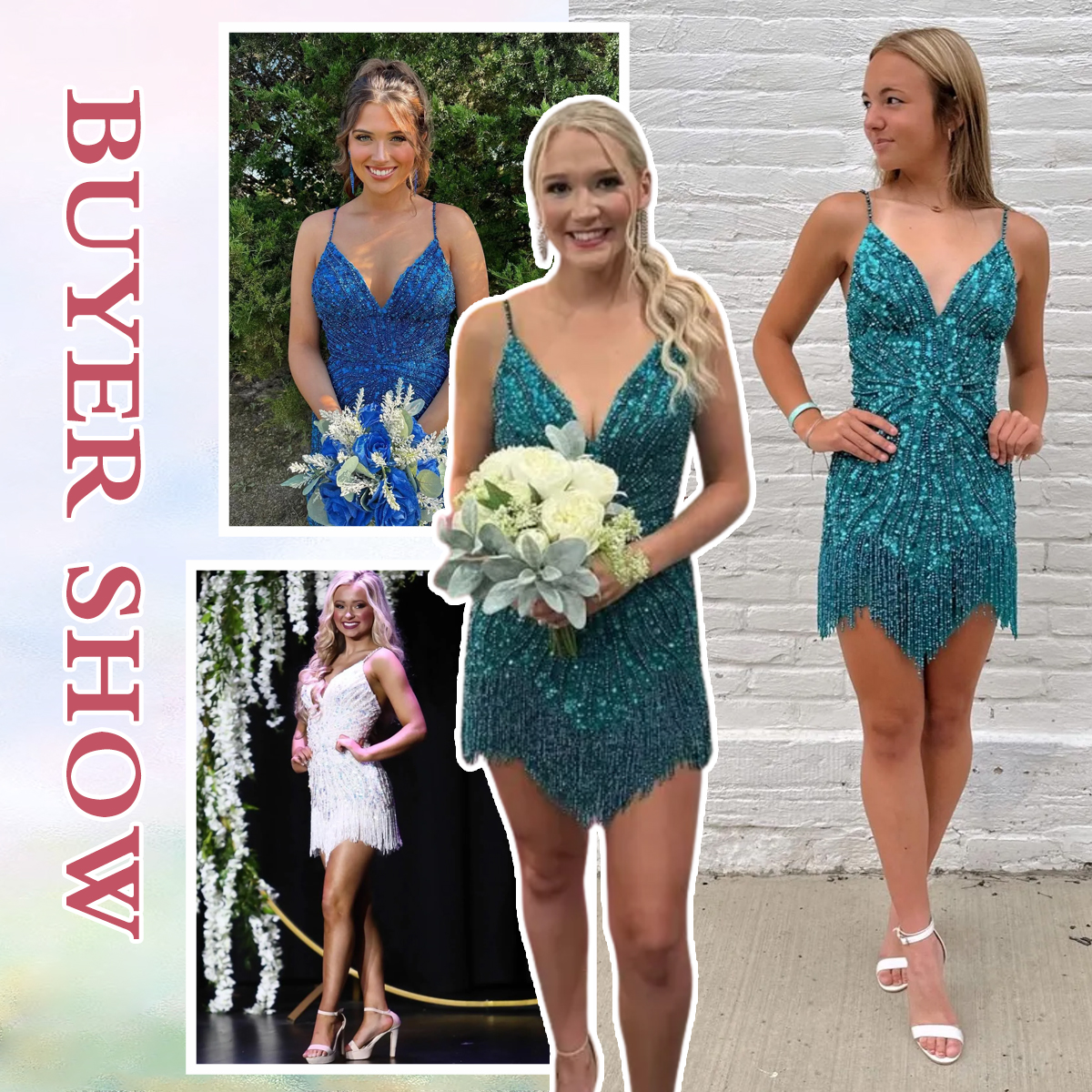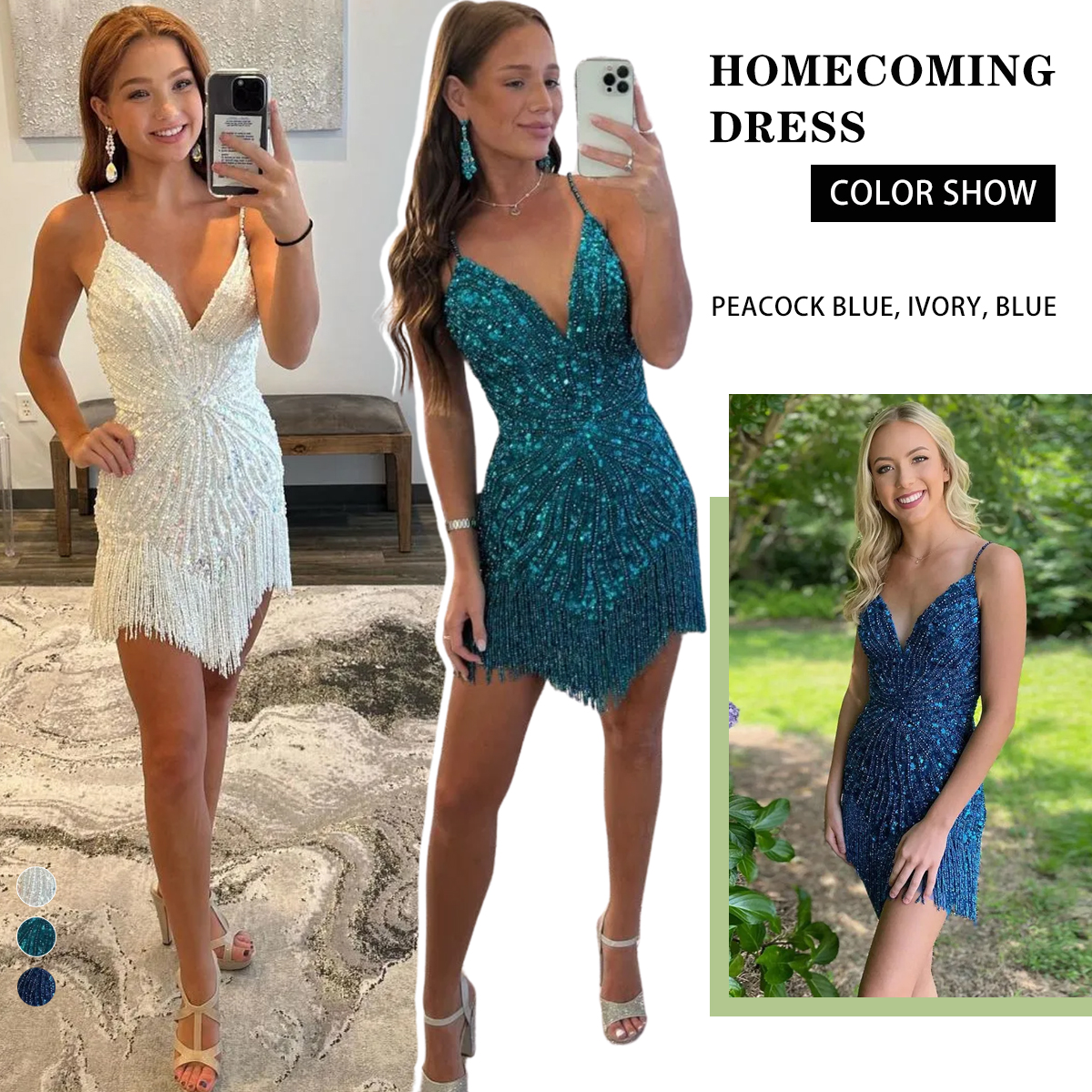 Make a Gorgeous and radiant entrance in the Berlinnova Women Peacock Blue Beaded Short Homecoming Dress. This sleek Tight silhouette is designed to hug and flatter your figure, featuring dynamic Fringe detailing that dances beautifully with every movement. The dress is supported by delicate Spaghetti Straps and crafted from glittering Sequin fabric, richly adorned with intricate Beading. |