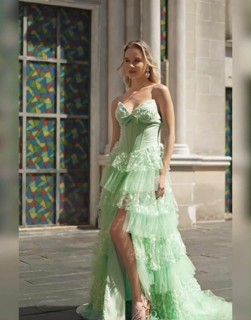 Green Strapless Corset Long Ruffled Prom Dress with Bow
