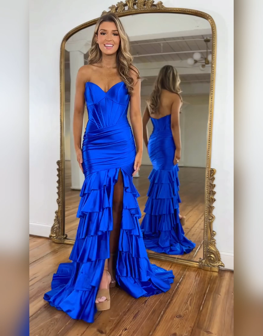 Royal Blue Mermaid Strapless Corset Tiered Satin Long Prom Dress with Slit