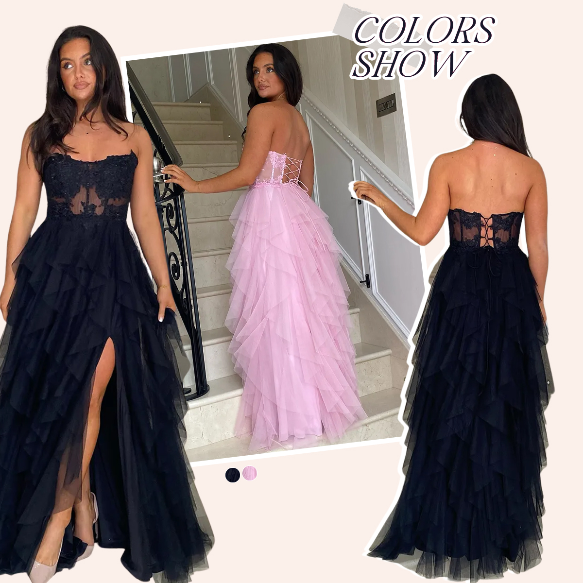 Effortlessly embody sophistication and elegance with the tiered prom dress. This tiered prom dress features cascading ruffles, creating a stunning silhouette. the strapless corset fit perfectly, hugging your curves, while the corset back ensures a perfect fit. Transitioning seamlessly from the bodice, the tiered skirt blooms into a sumptuous cascade of layered tulle. A striking left slit serves to elongate the leg line, creating an illusion of being taller and slimmer. The intricate appliques of the prom dress are delicately placed to create a stunning, textured look. Made with high-quality materials, this dress is perfect for making a statement at proms, parties, evenings, gala, pageants, or any formal events. |