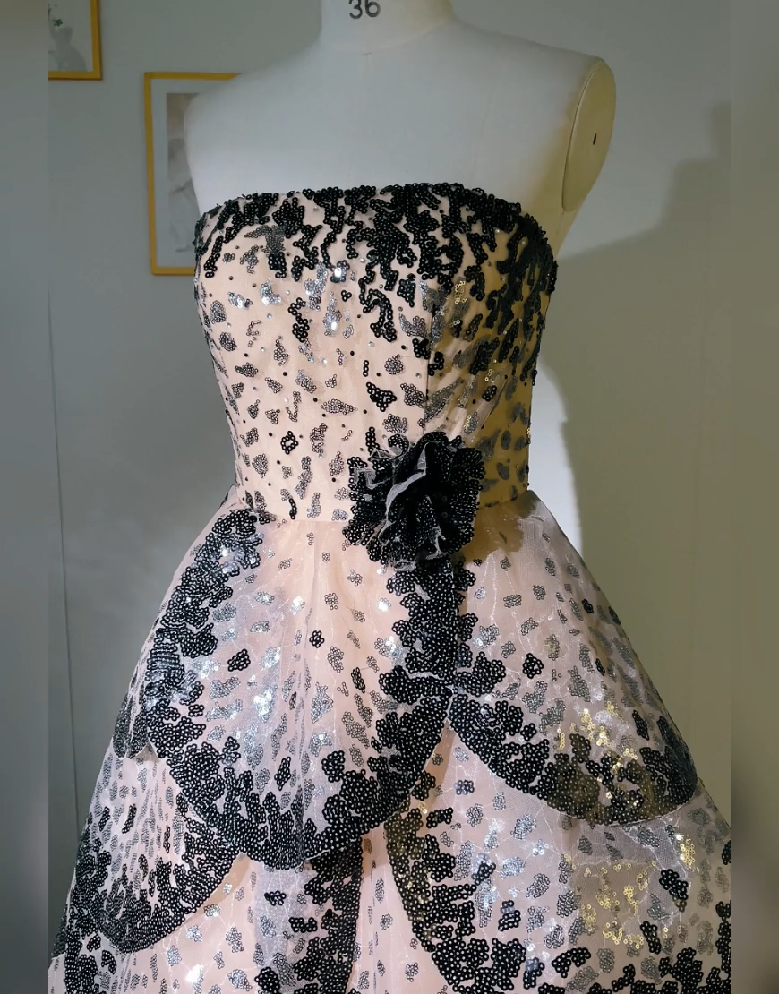 Sparkly Black and Apricot Strapless Long A-Line Prom Dress with Sequin