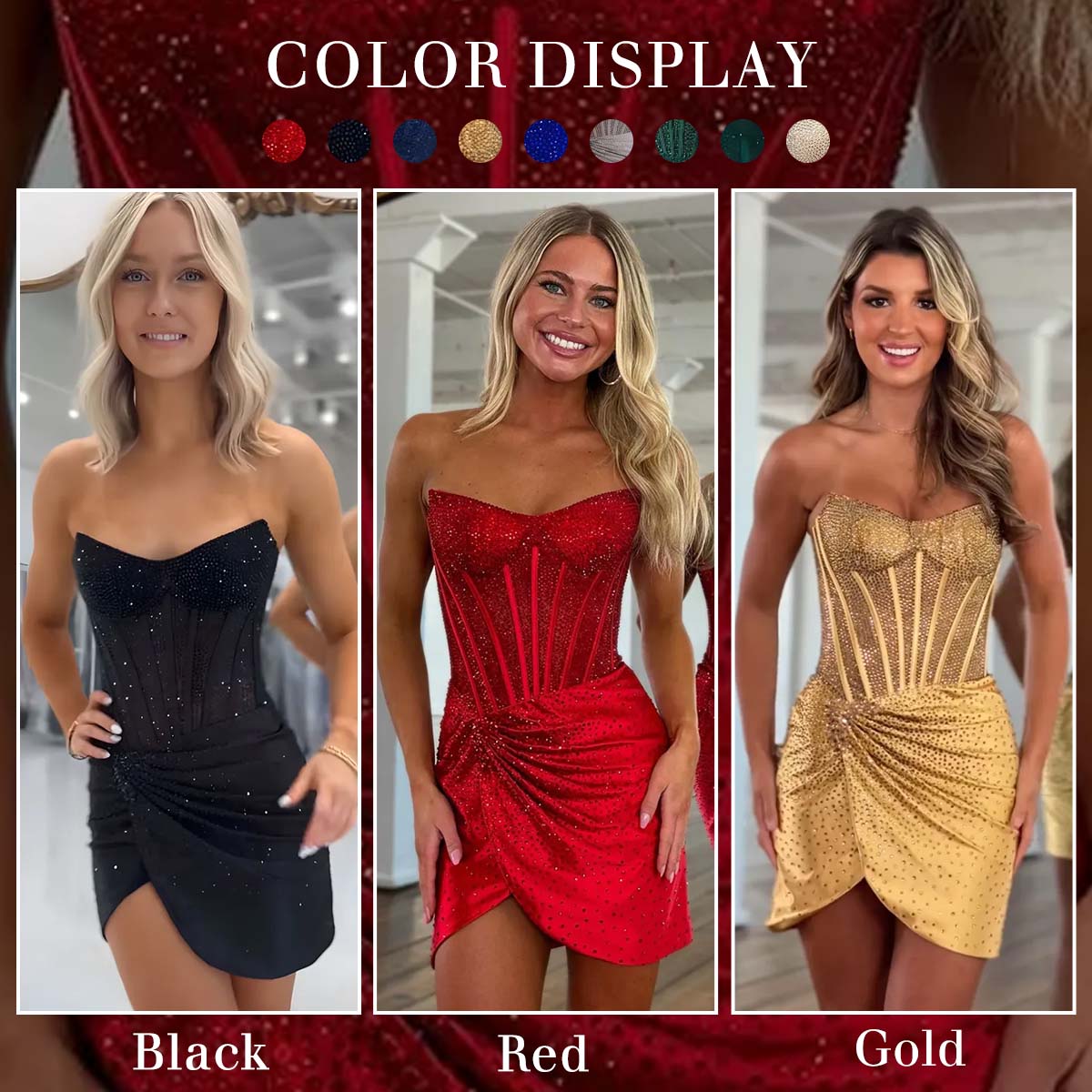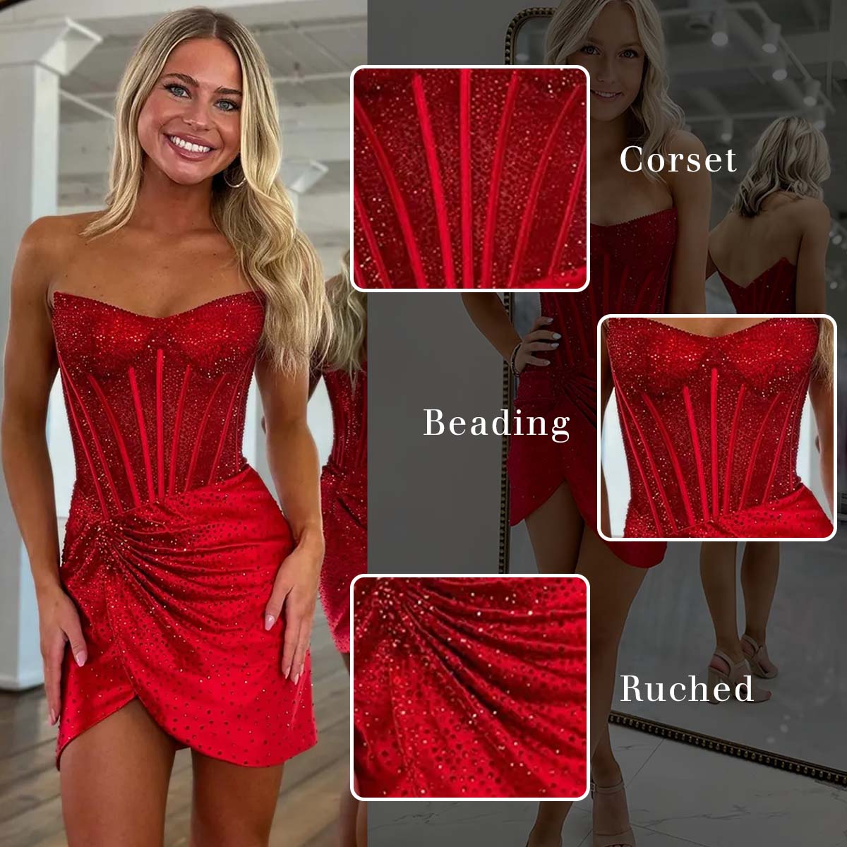 Occasion: Elegance defines Sparkly Red Corset Tight Strapless Short Homecoming Dress with Beading. It showcases a strapless, sweetheart neckline corset bodice, intricately adorned with shimmering beading that adds a touch of glamour. The ruched detailing on the skirt creates a flattering, asymmetric silhouette, enhancing the overall allure. Whether you're heading to homecoming, school events, parties, or a fun night out, this dress brings elegance, confidence, and a touch of sparkle to your look.