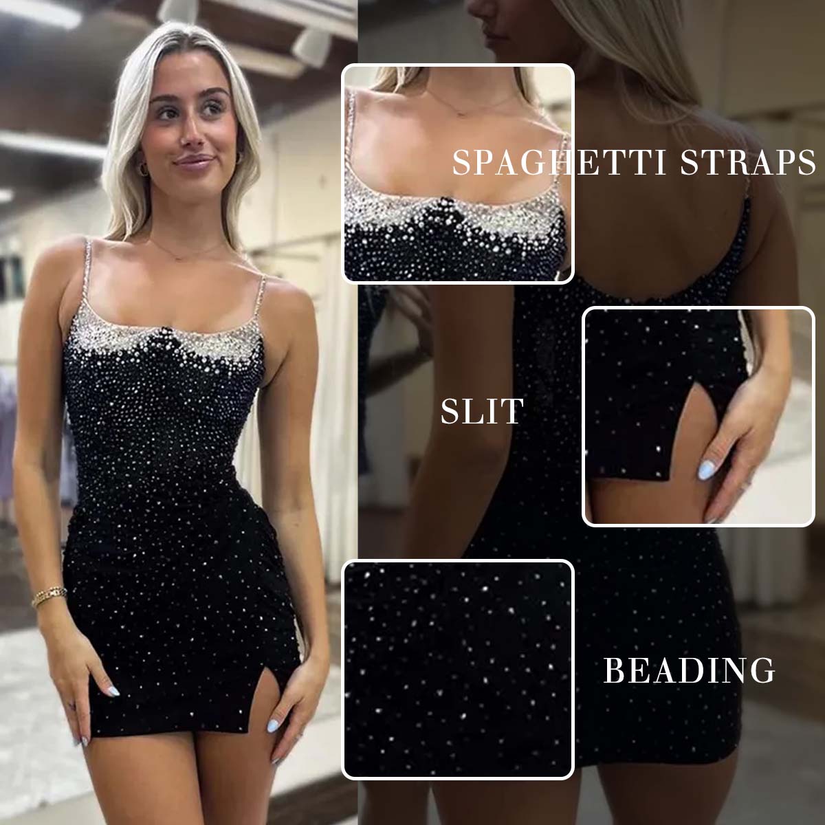 | DESCRIPTION: | Sparkly Black Beaded Tight Spaghetti Straps Homecoming Dress is a show-stopper! It has a corset bodice that cinches the waist for a flattering fit. The top is adorned with delicate beading, adding sparkle and elegance. It features thin, decorative spaghetti straps and a ruched, body con skirt with a subtle side slit. Hidden back zipper. |