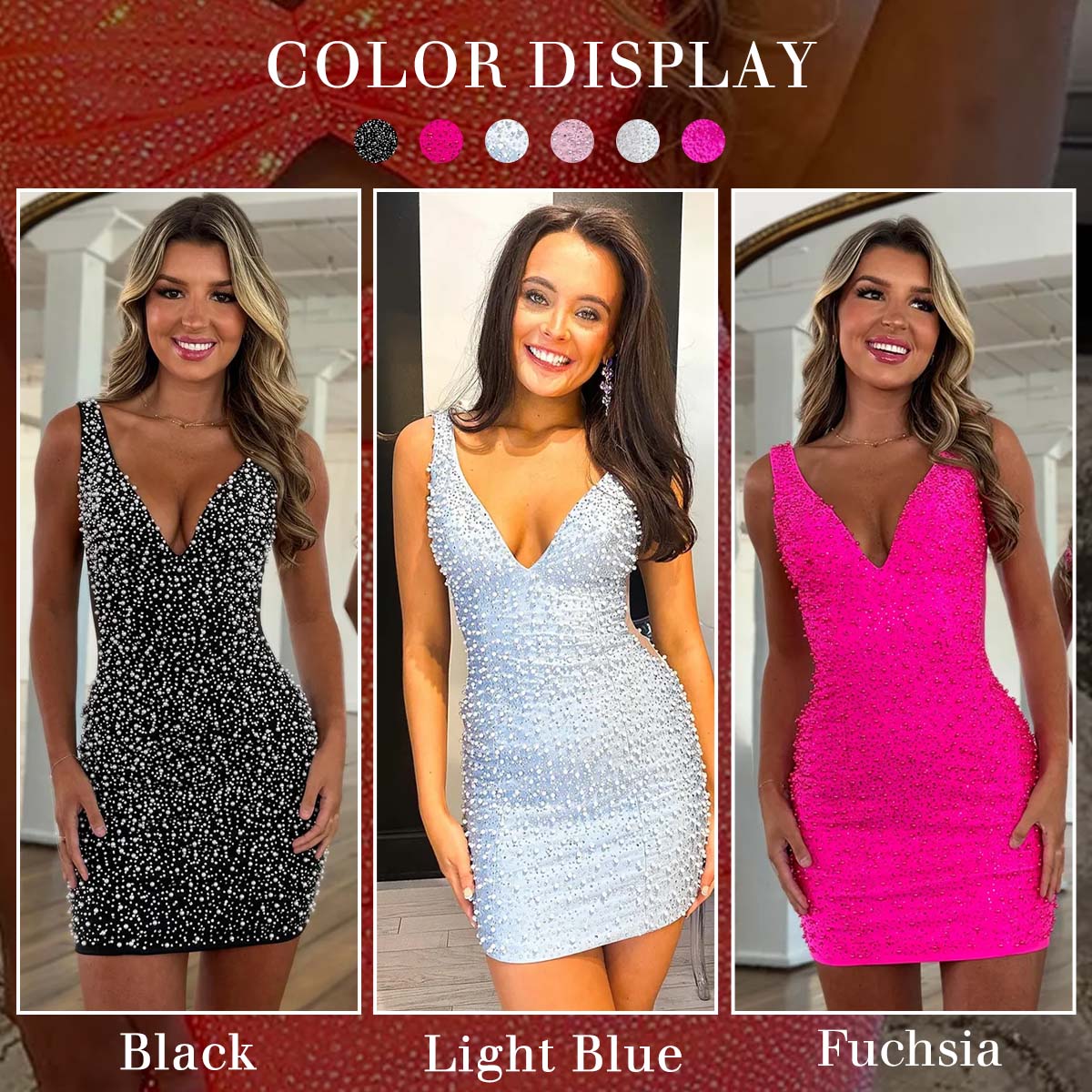 Description: Sparkly Pink V Neck Short Homecoming Dress with Beading is a show-stealing piece. It’s a bodycon, short-length gown with a striking deep V-neckline. The entire dress is lavishly covered in intricate beading, creating a dazzling, shimmering effect that catches the light from every angle. The beading forms a scattered, sparkling pattern over the black base fabric, giving it a glamorous and eye-catching look. The dress also features a low-cut back that mirrors the front’s alluring style, ensuring a head-turning silhouette from every view.