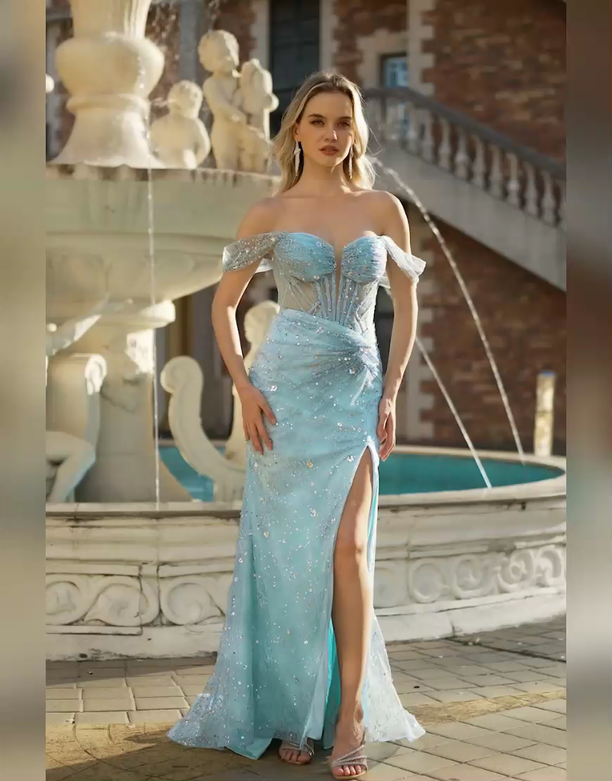 Sparkly Blue Mermaid Off the Shoulder Corset Long Prom Dress with Slit