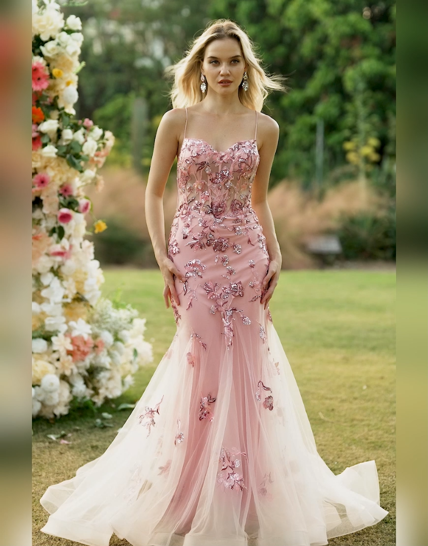 Sparkly Blush Floral Corset Mermaid Long Prom Dress