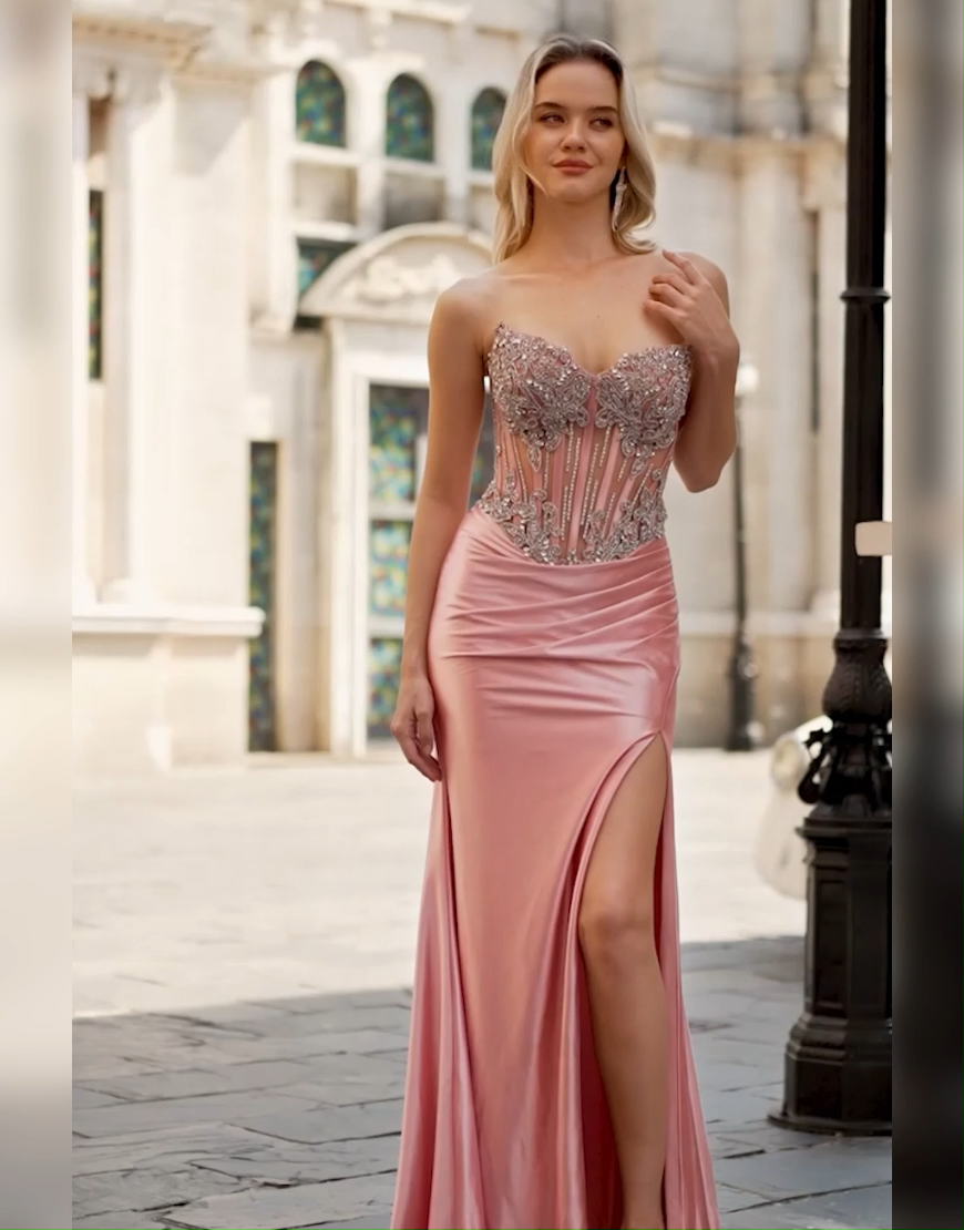 Sparkly Blush Mermaid Strapless Corset Long Prom Dress with Slit