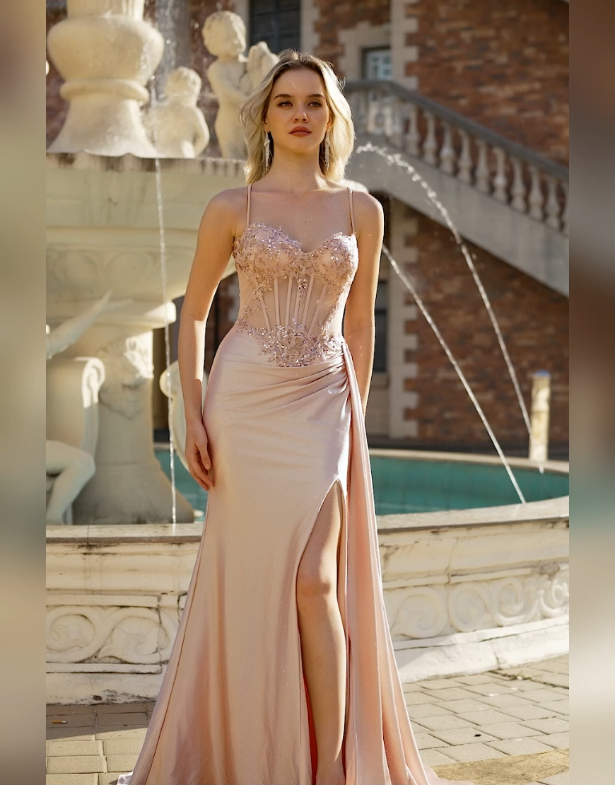 Sparkly Champagne Mermaid Spaghetti Straps Satin Long Prom Dress with Beading