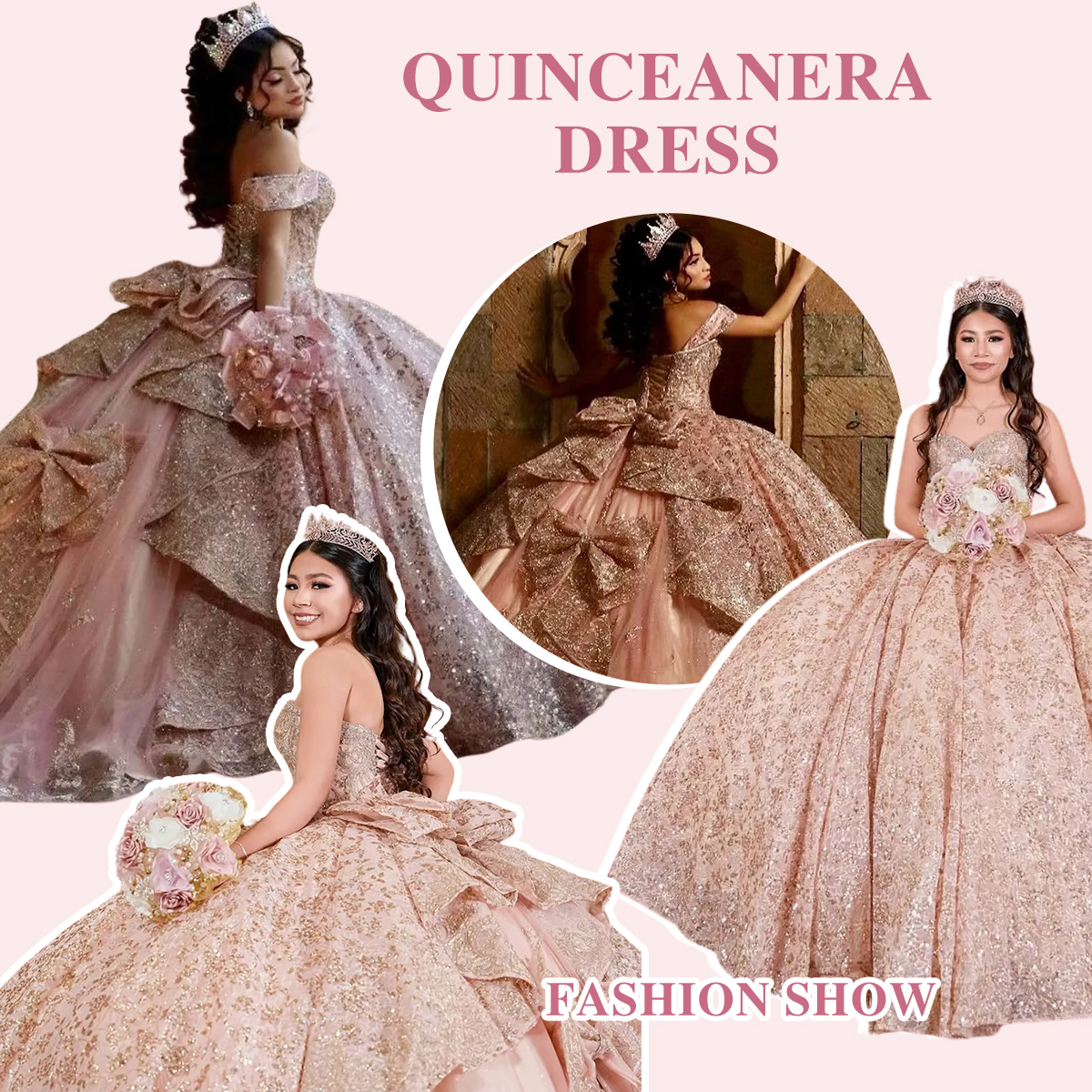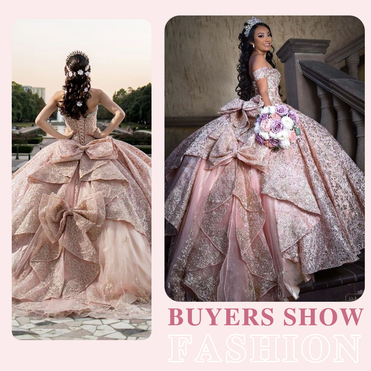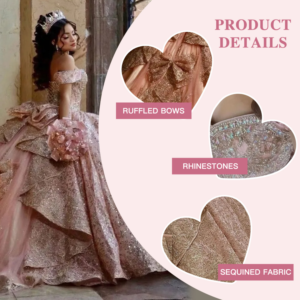 | DESCRIPTION: | Make your Quinceanera unforgettable in Sparkly Dusty Rose Off the Shoulder Rhinestones Ruffles Bows Quinceanera Dress designed to captivate! It features glitter tulle and delicate appliques, which adorns the dress, offering intricate texture and a luxurious feel. The off the shoulder neckline adds a touch of romantic charm, while the lace-up bow back ensures youthful elegance. The structured corset bodice ensures a flattering, sculpted fit. Pair with your favorite pearl snowflake flower bridal crown for an elevated look! |