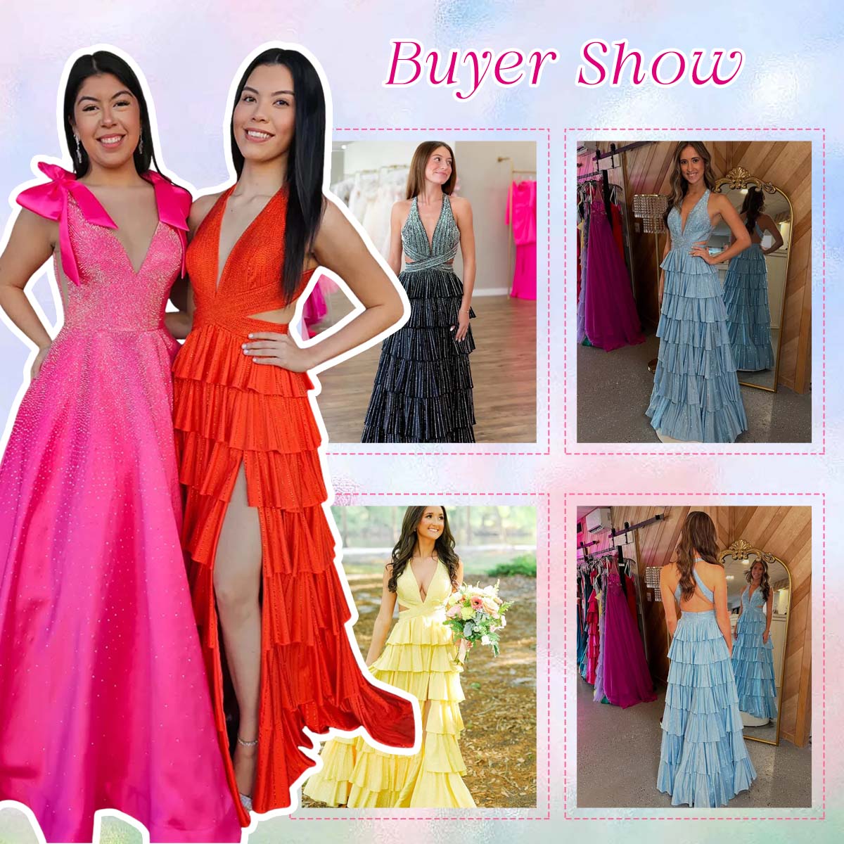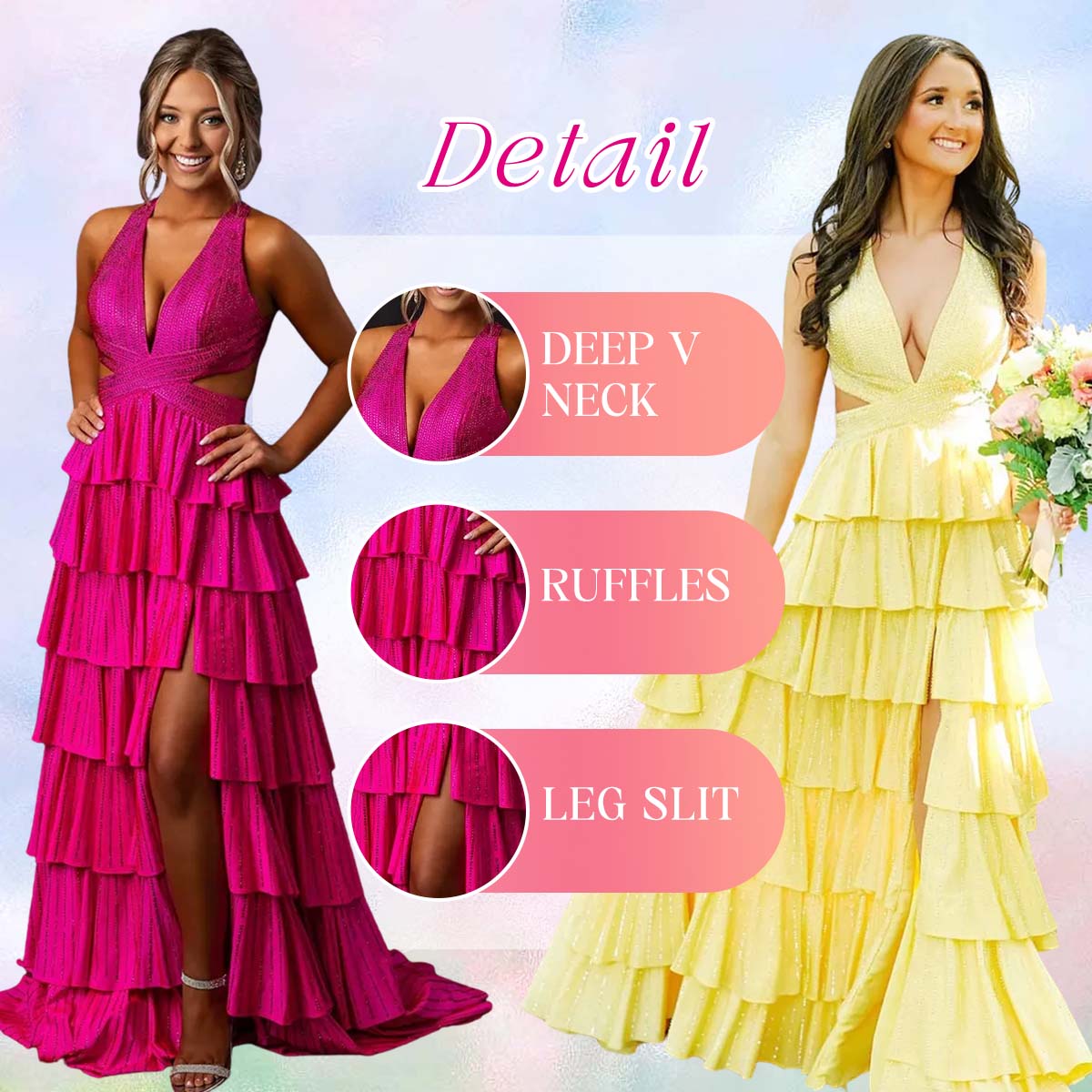 | OCCASION: | Capture the spotlight in our Sparkly Fuchsia Halter Beaded Ruffled Long Prom Dress with Slit! This dynamic gown features a flattering halter neckline and a plunge bodice with chic cut out detailing. The vibrant fabric is subtly beaded for sparkle, and the A-line skirt flows into dramatic tiered ruffles with a high slit. Available in various colors and sizes. Shine bright and stand out in style. Perfect for occasions like proms, parties, evenings, gala, pageants, or any formal events. |