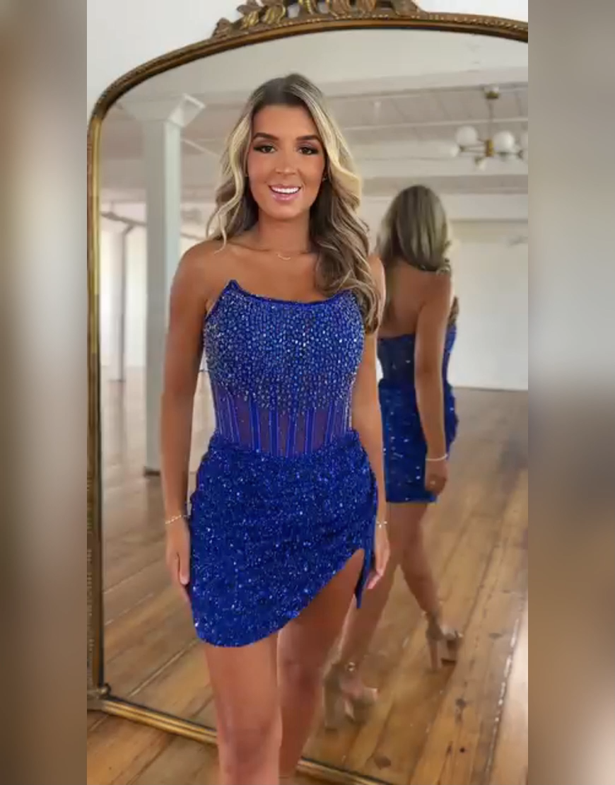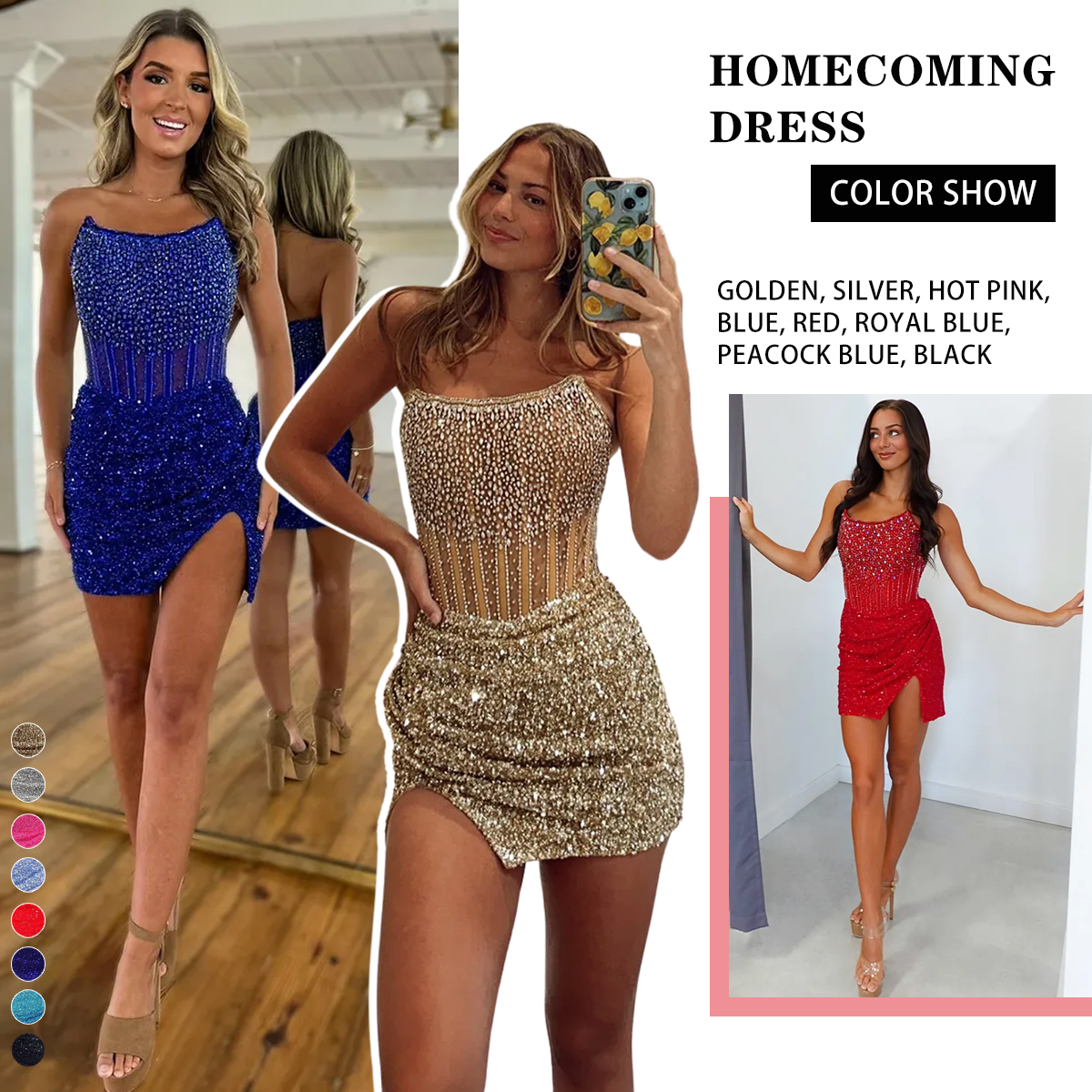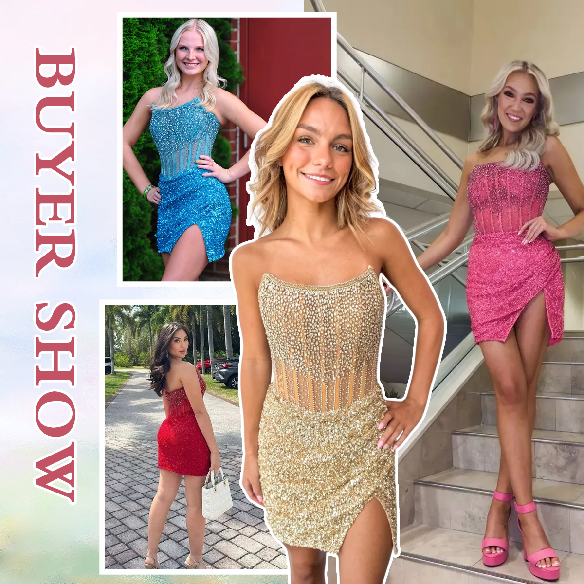 Make a dazzling entrance in the Berlinnova Women Sparkly Golden Corset Homecoming Dress. This chic Tight silhouette is designed to hug and flatter your figure, featuring a fashion-forward Corset bodice for structure and style. The Strapless neckline highlights the shoulders beautifully, while the entire dress is richly embellished with glittering Rhinestones and shimmering Sequins. |