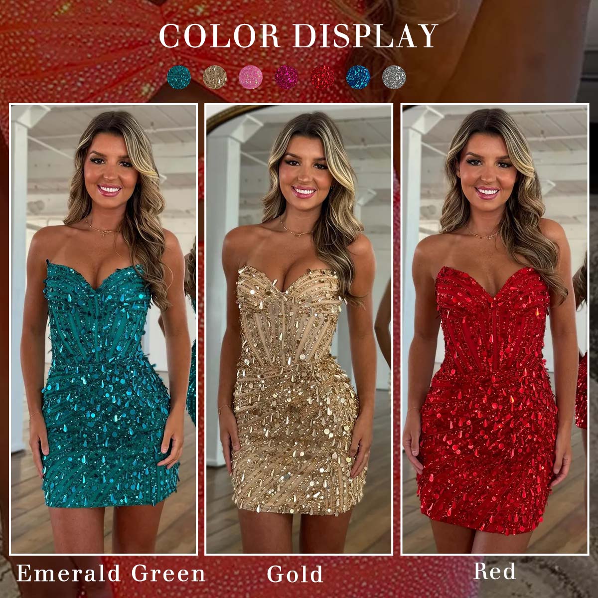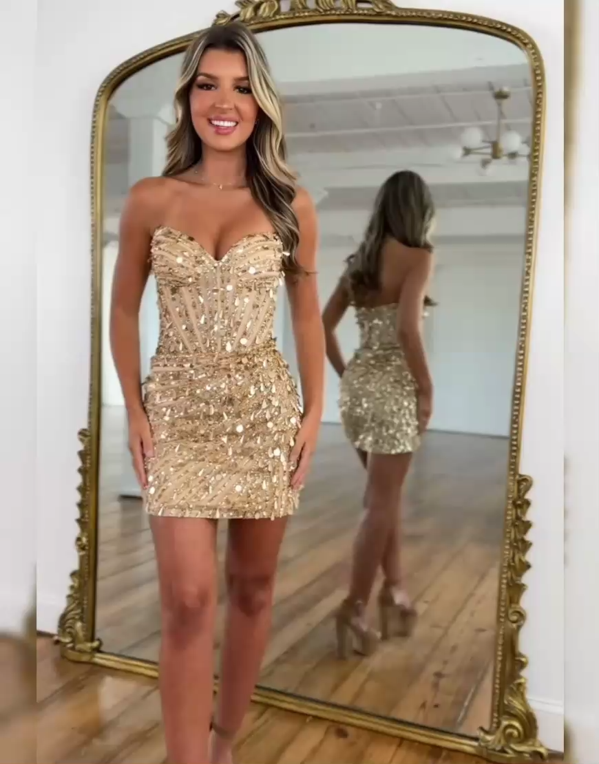 Occasion: Elegance meets glamour in Sparkly Gold Sequin Tight Sweetheart Short Corset Homecoming Dress. It features a strapless design with a sweetheart neckline, accentuating the figure beautifully. The bodice is structured like a corset, providing a flattering shape. Adorned all over with shimmering sequins, it catches the light from every angle. The form - fitting silhouette hugs the body, showcasing curves, while the short length adds a touch of playfulness. Whether you're heading to homecoming, school events, parties, cocktail, or a fun night out, this dress brings elegance, confidence, and a touch of sparkle to your look.