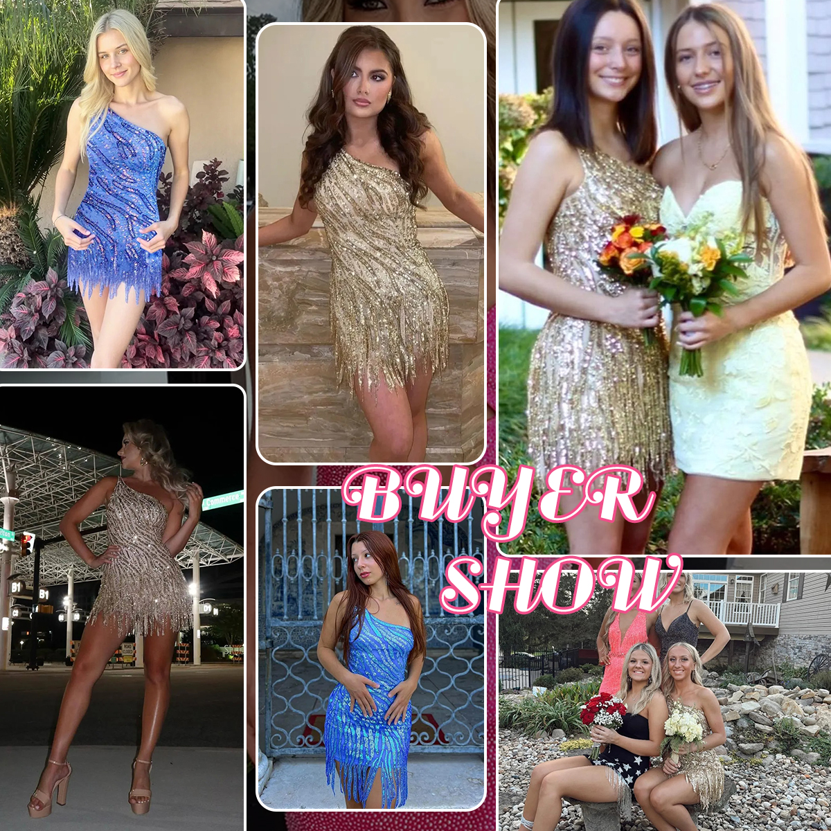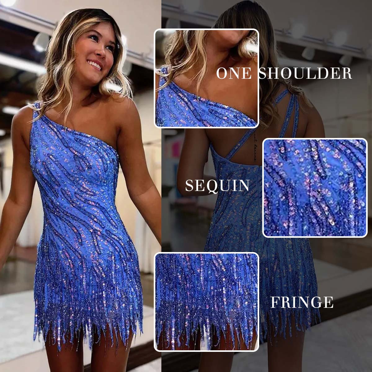 Elegance shimmers in Sparkly Blue One Shoulder Short Homecoming Dress with Fringe. It’s adorned with shimmering sequins, adding a touch of glamour. The body-hugging silhouette accentuates curves, while the fringed hem brings a playful, dynamic flair. Perfect for making a statement at parties or special events, the sequin detailing ensures you’ll stand out with every move. Whether you're heading to homecoming, school events, parties, or a fun night out, this dress brings elegance, confidence, and a touch of sparkle to your look. |