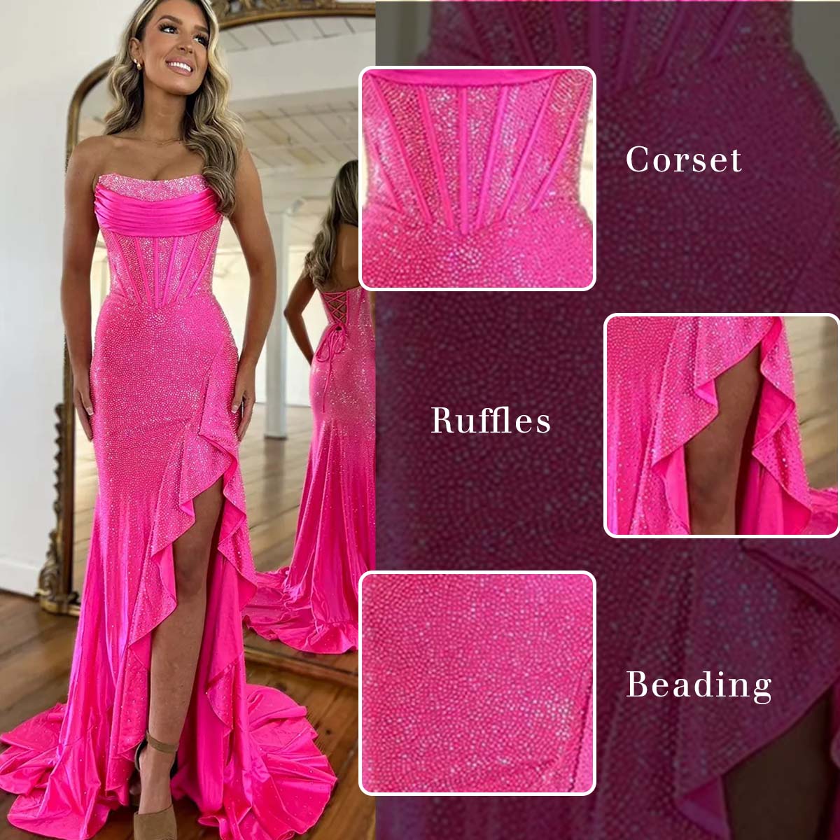 | OCCASION: | Sparkly Orange Mermaid Strapless Corset Beaded Ruffle Long Prom Dress with Slit features a strapless neckline. The bodice, designed as a corset, is adorned with delicate beading that adds a subtle sparkle. The ruched detailing on the bustline and the structured corset create a flattering silhouette. The mermaid skirt has a high side slit with ruffled accents, flowing into a dramatic train. Available in a variety of colors and sizes, including custom sizes. Sizes are available from US2 to US26W, and you can also customize your size for the perfect fit. Step into the spotlight with this beautiful and elegant dress. Perfect for a range of occasions like proms, parties, military balls, or pageant. |
