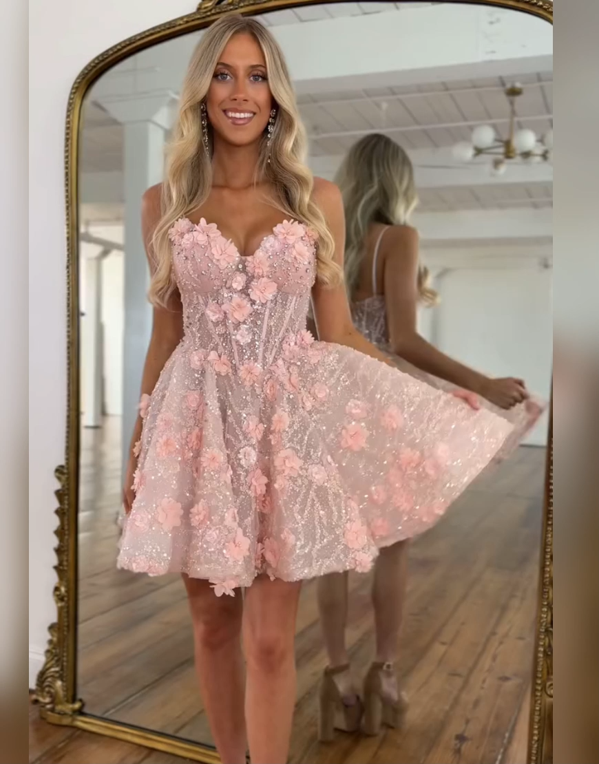 Sparkly Pink A Line Floral Short Corset Homecoming Dress with Rhinestones