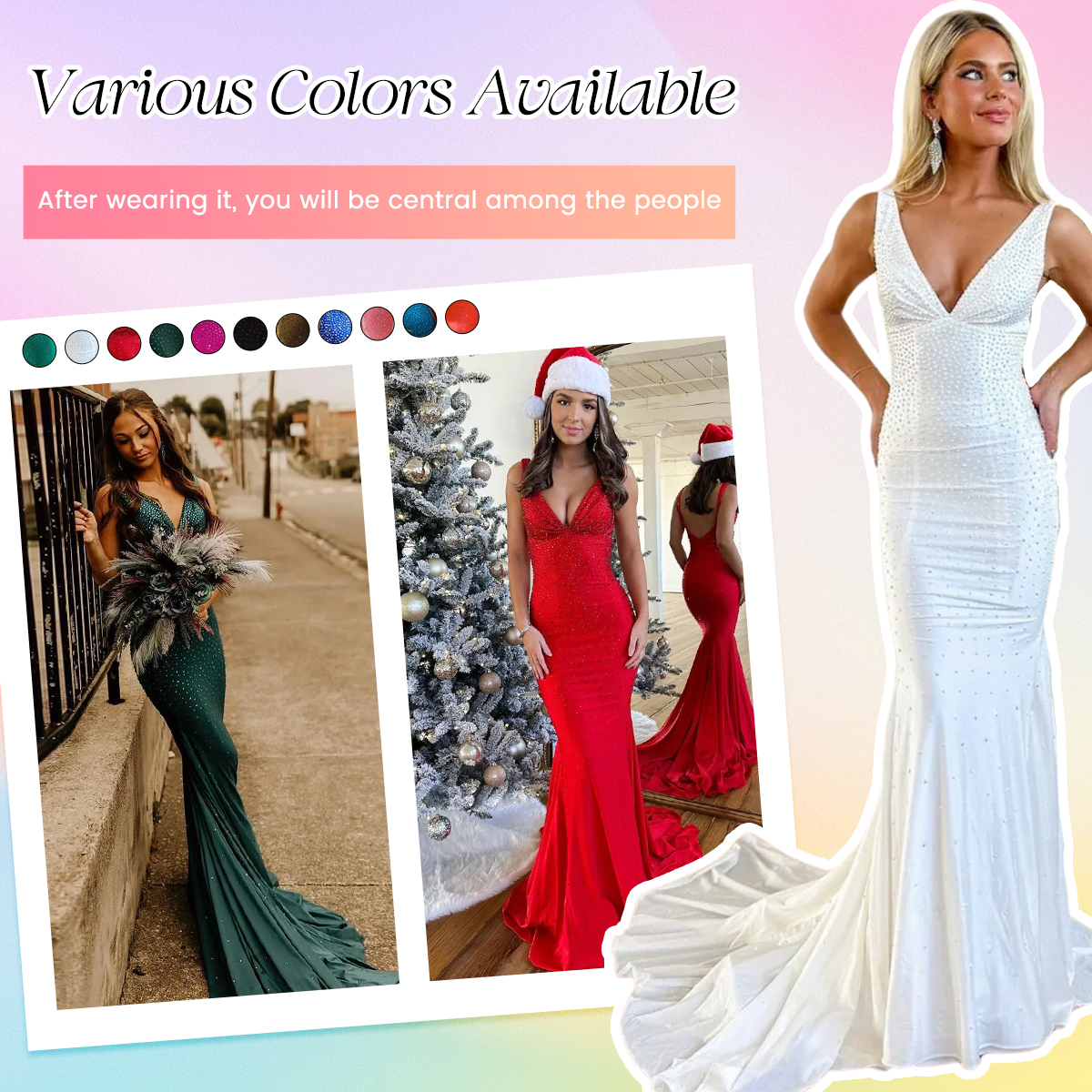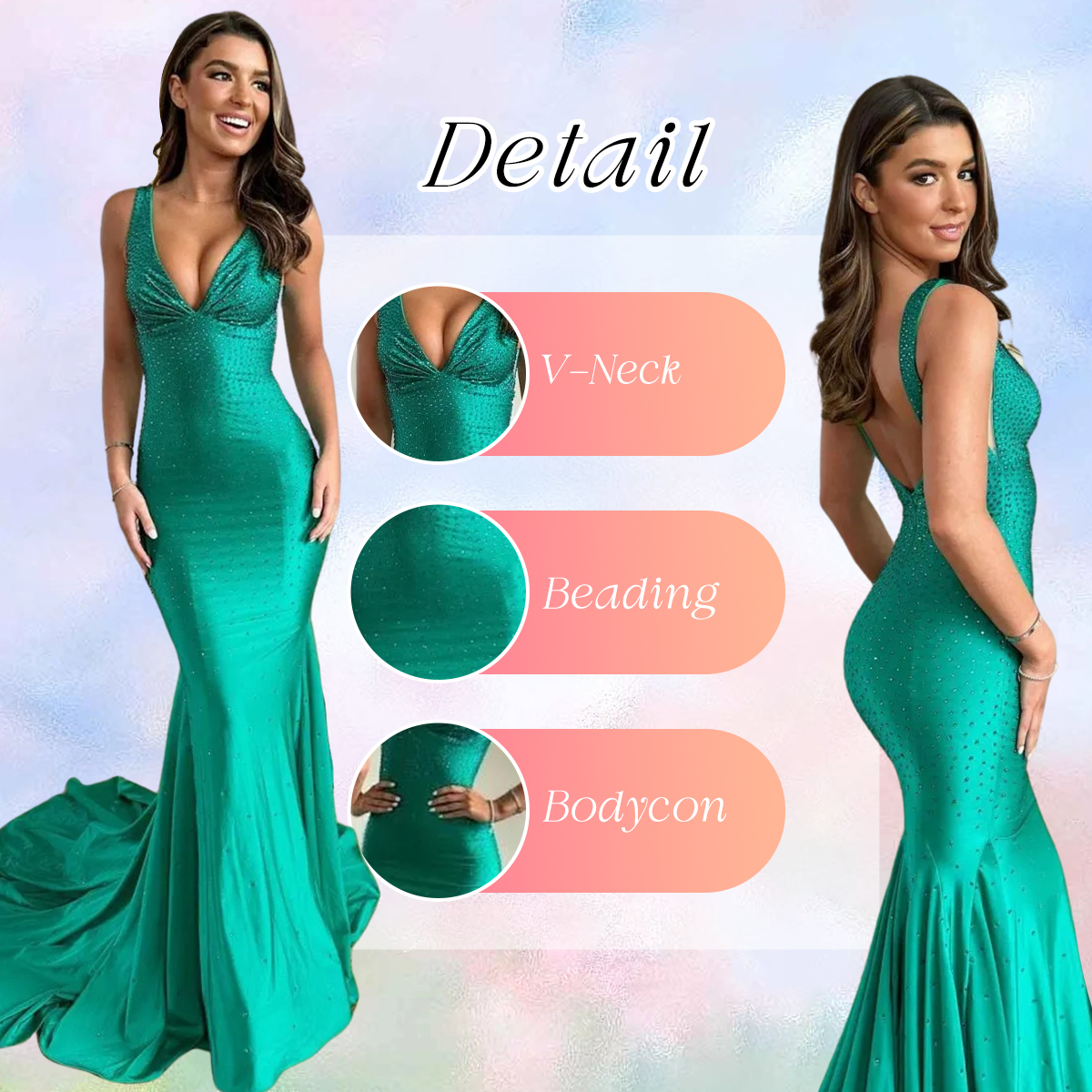 TSparkly Pool Green Mermaid Satin Deep V-Neck Long Prom Dress with Beading is an exquisite choice for any special occasion. The mermaid silhouette and ruched detail create a stunning look, while the full beaded embellishments add a touch of sparkle. Available in a range of elegant colors including Pool Green, White, Red, Emerald Green, Hot Pink, Black, and Olive, this dress is sure to make a statement. With sizes ranging from US2 to Custom Size, it's perfect for proms, parties, formal events, galas, evenings and military balls. Look elegant and glamorous in this beautiful prom dress. |