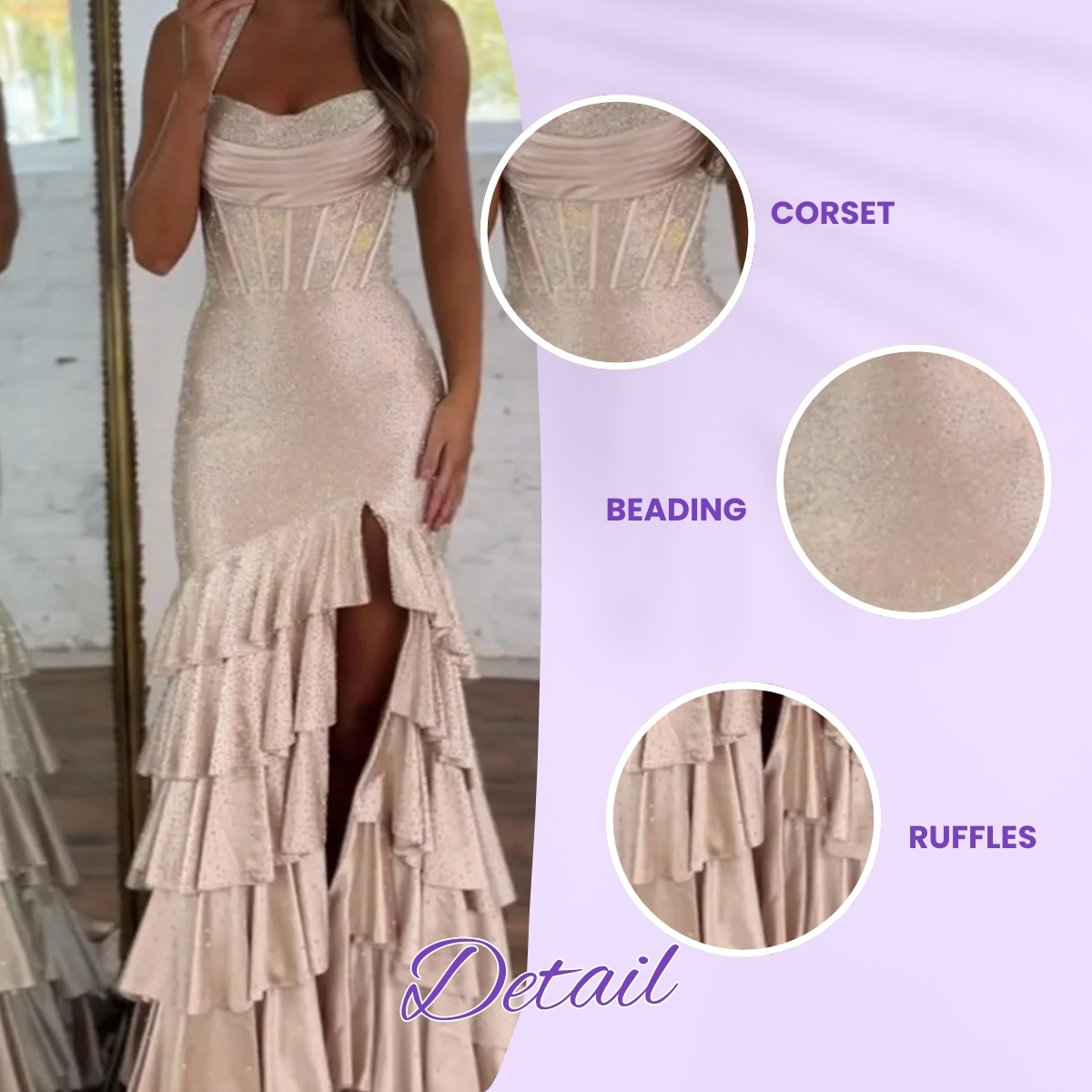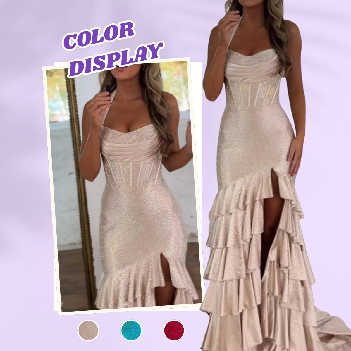 Occasion: Make a vibrant statement in this Sparkly Red Mermaid Prom Dress. This striking gown features a structured corset bodice with visible boning and a unique scoop neckline accented by a gathered fabric detail. The design is elevated by all-over shimmering beads and a halter-style strap that leads to a sophisticated criss-cross lace-up back. Crafted from lustrous satin, the form-fitting silhouette flares into a dramatic mermaid skirt featuring voluminous tiered ruffles and a daring high slit for modern movement. This bold and glamorous ensemble is perfect for prom, pageants, or high-end formal events, offering a sophisticated jewel-toned look that is designed to stand out.
