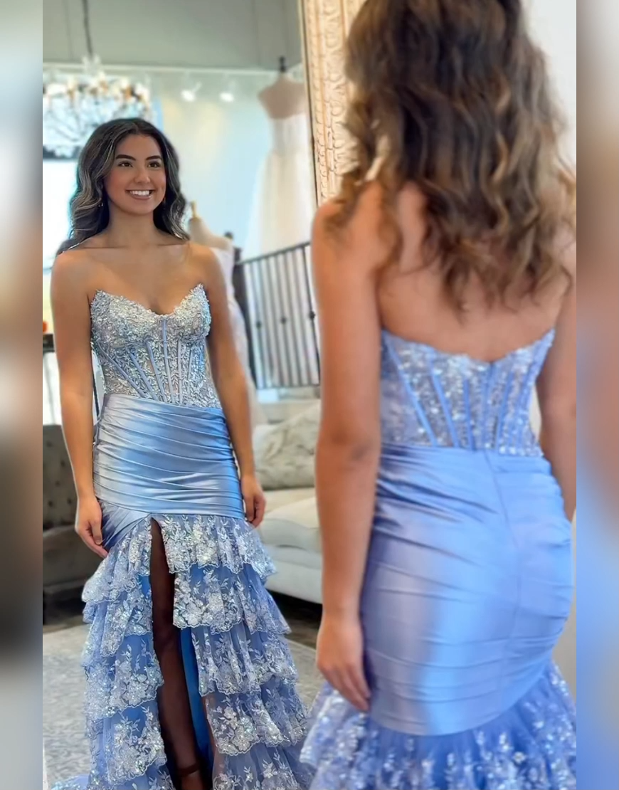 | OCCASION: | Make a dramatic entrance in this Sparkly Red Satin Mermaid Prom Dress. It features a structured strapless corset bodice adorned with intricate all-over sequins and boning details. The design is completed by a voluminous ruffled tiered skirt with a daring high slit and a sweeping train. This show-stopping look is ideal for prom, pageants, red-carpet events, or formal galas, offering a perfect blend of high-fashion texture and classic red-carpet glamour. |