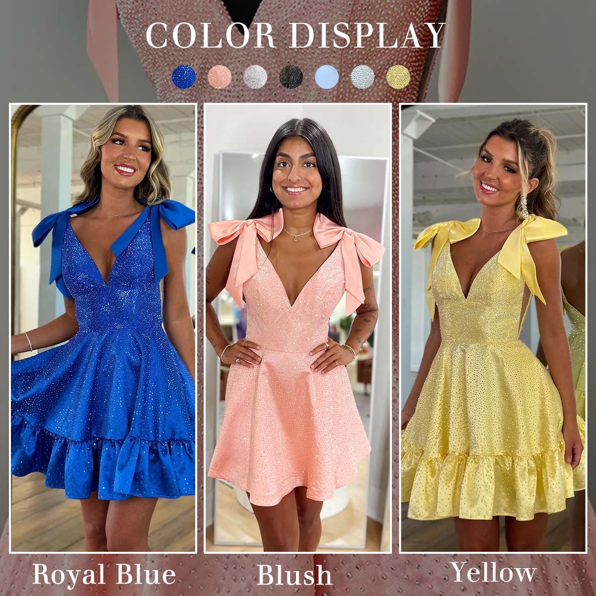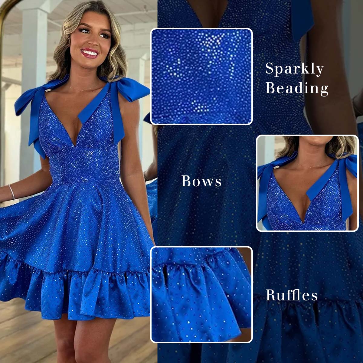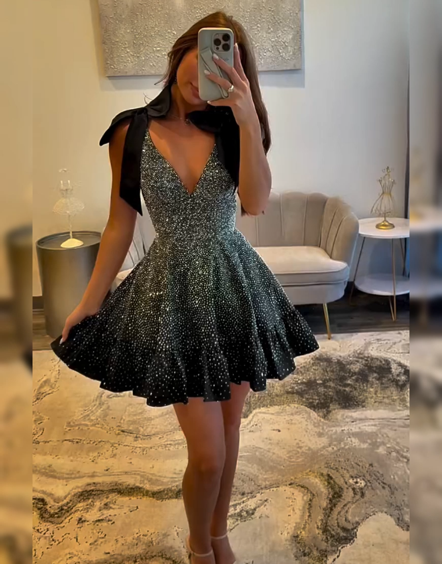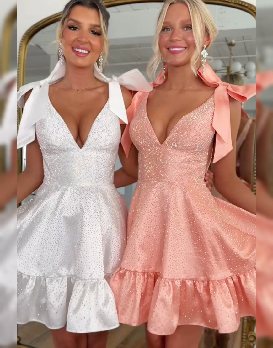 Occasion: Sparkly Yellow Ruffled A Line Short Homecoming Dress with Beading is a stunner! It has a deep V-neckline and shoulder straps adorned with cute bows. The whole dress is covered in sparkling beading, giving it a dazzling look. The skirt features playful ruffles, adding a flirty and fun vibe. Whether you're heading to homecoming, school events, parties, or a fun night out, this dress brings elegance, confidence, and a touch of sparkle to your look.