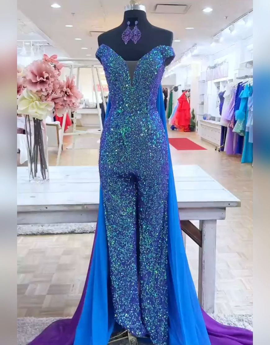 Description: Elegance radiates from Sparkly Royal Blue Sequin Tight Long Homecoming Jumpsuits with Cape. Crafted with shimmering sequins that catch and reflect light beautifully, it features an off-the-shoulder, deep-V neckline for a touch of allure. The bodycon silhouette hugs the figure gracefully, while the dramatic, flowing cape-like train in gradient hues of royal blue adds a regal, show-stopping element, this sequin-adorned jumpsuit blends sophistication with bold, glamorous design.