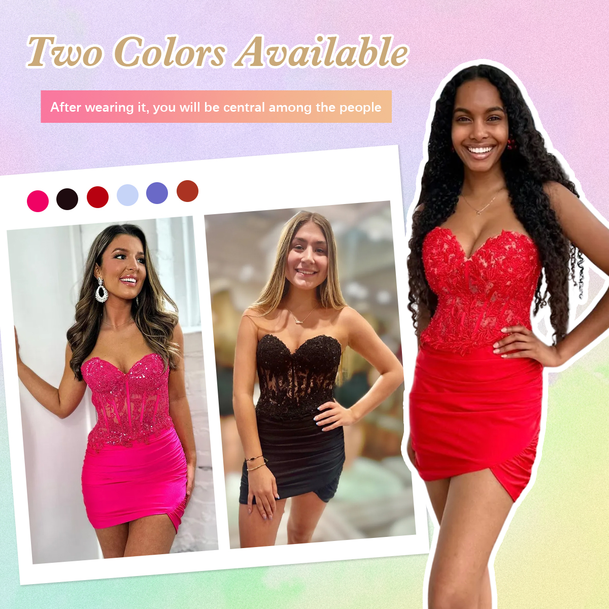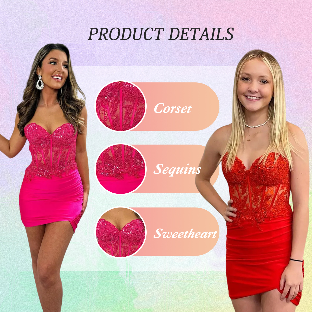 | OCCASION: | Twirl the night away in Sparkly Sequins Sweetheart Bodycon Homecoming Dress! This dress is a fitted style with a sweetheart neckline, complete with a corset bodice and bodycon version that give you a flattering silhouette. This dress is covered in sequin patterns that will photograph seamlessly. Available in a range of vibrant colors. Choose from a variety of US sizes, including Custom Size options. Perfect for proms, parties, military balls, pageant matches, and any special occasion. |
