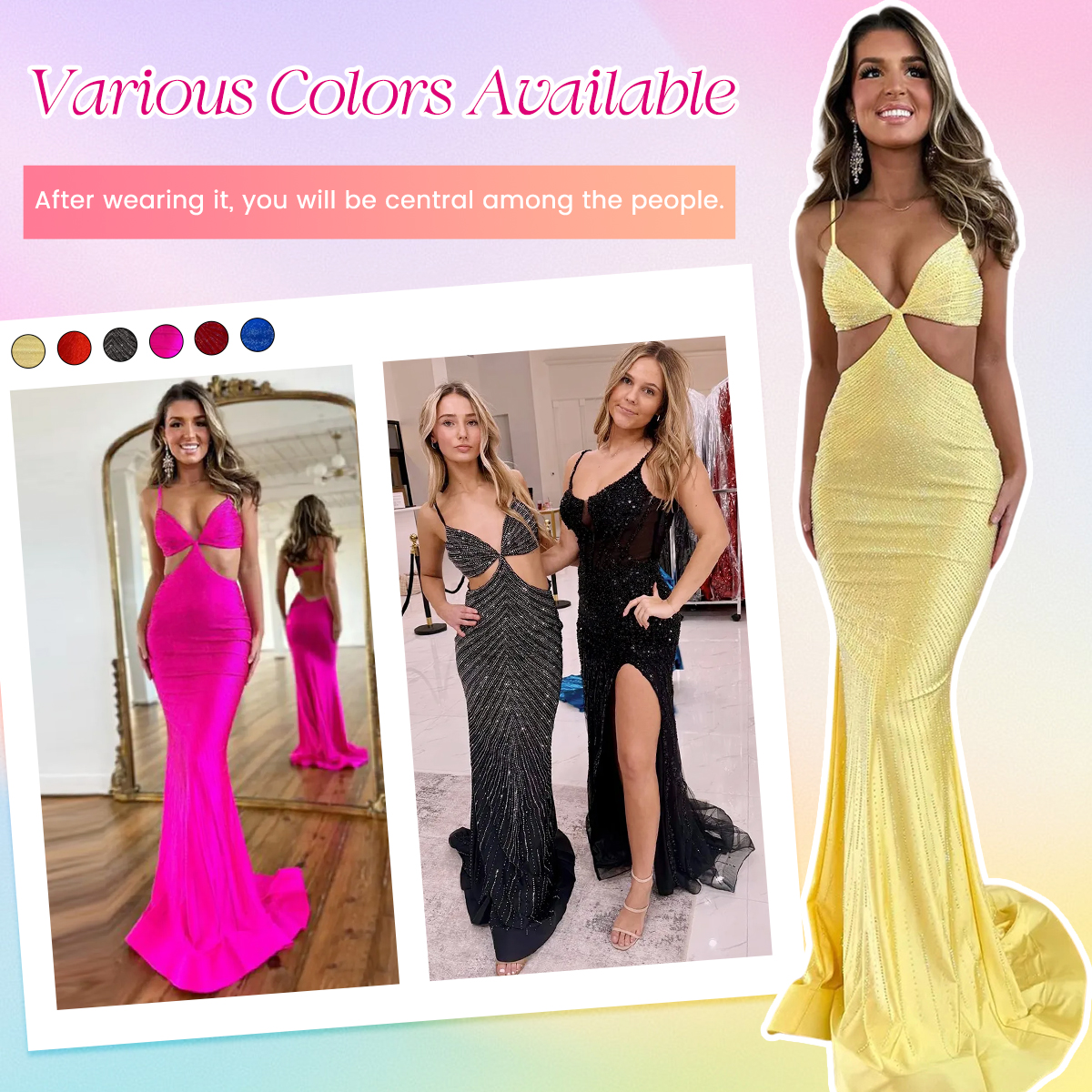 | OCCASION: | Sparkly Yellow Mermaid Cut Out Long Beaded Prom Dress is a stunning evening gown perfect for special occasions. It features a vibrant yellow hue that catches the eye. The dress has a daring design with a deep V-neckline and cut-out details at the midriff, adding a touch of allure. What truly makes it stand out is the exquisite beading. Delicate beads are meticulously arranged all over the gown, creating a sparkling effect that enhances its elegance. The mermaid silhouette hugs the body beautifully and flows into a graceful train, ensuring you make a grand entrance. Perfect for proms, parties, military balls, pageant matches, and galas. |