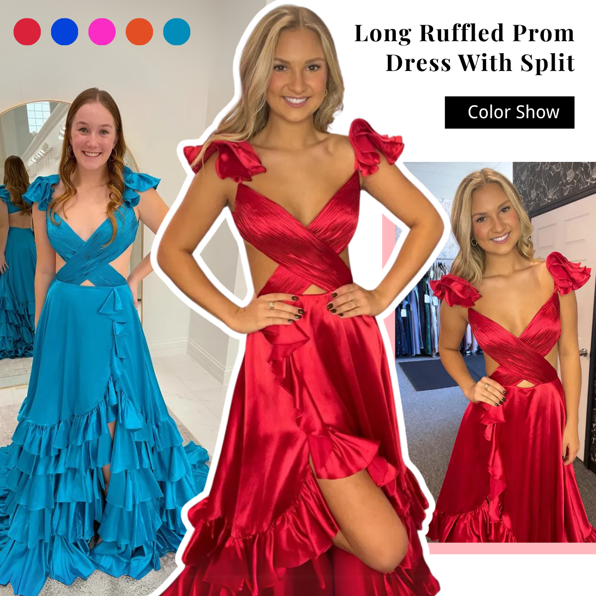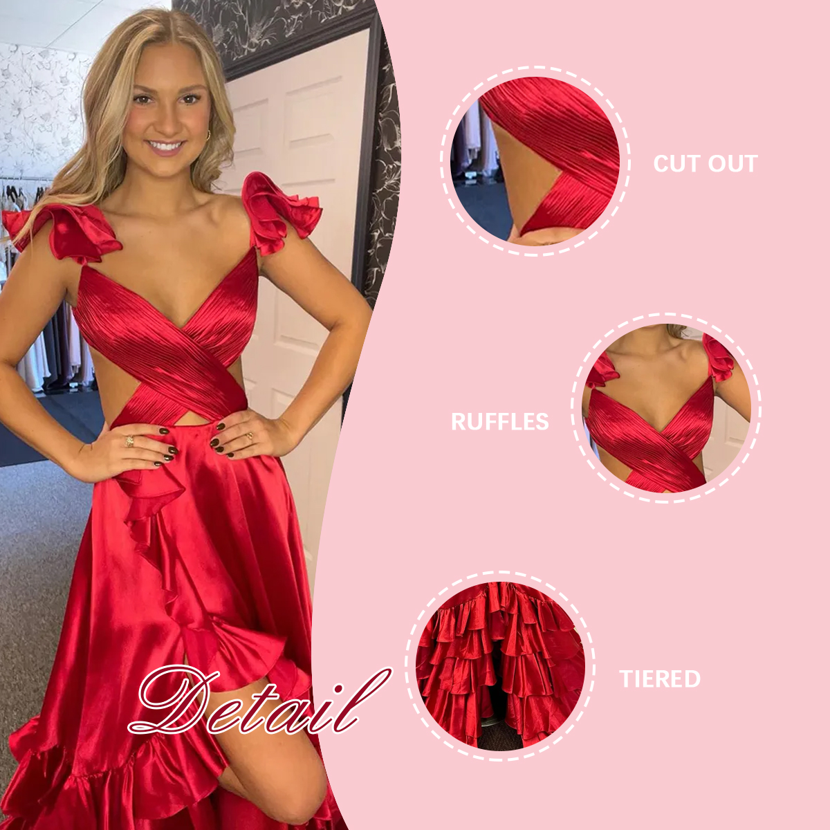 | OCCASION: | Stylish Red A-Line V-Neck Cutout Waist Long Ruffled Prom Dress With Split is a show-stopper. Crafted from satin, it features a deep V neckline and dramatic, ruffled details. The bodice has a bold cut-out design with a criss-cross strap, adding an edgy yet elegant touch. The skirt flows into multiple tiers of ruffles, complemented by a high-slit that reveals a leg, creating a dynamic and glamorous silhouette. Whether you are dressing it for a wedding party, prom, evening party, pageant, gala or any other occasion, this party dress will be your lovely partner. |