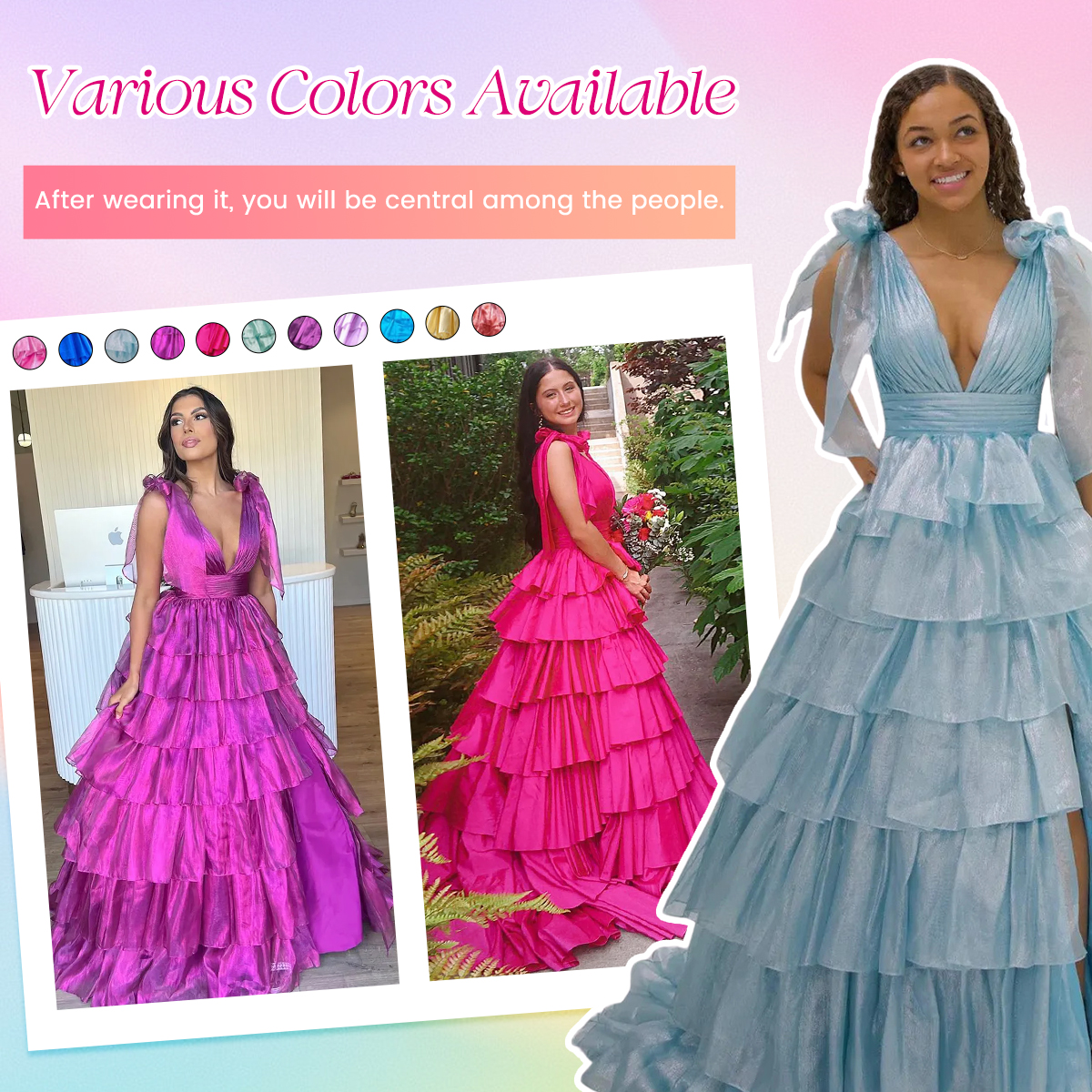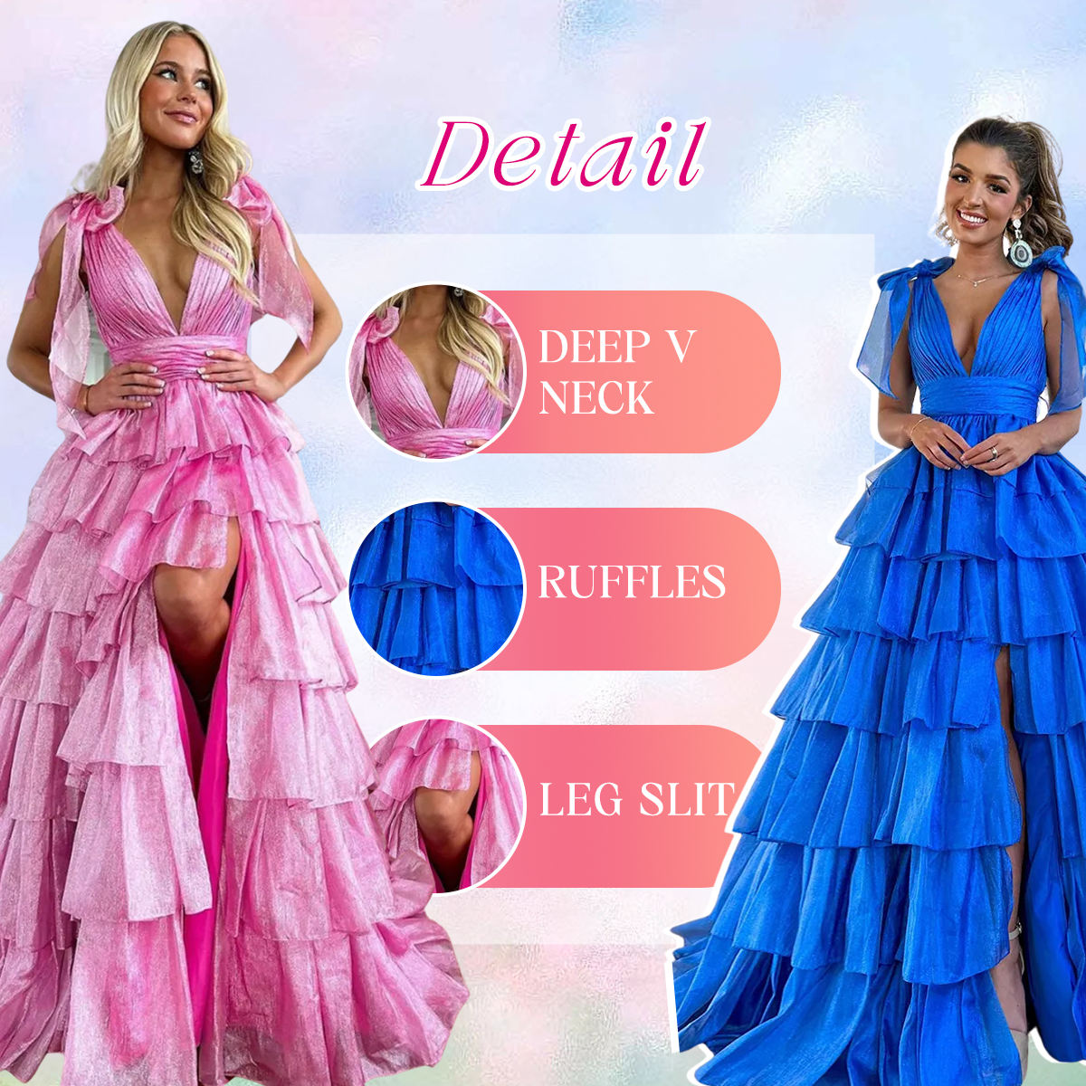 | OCCASION: | This Glitter Trendy Pink A-Line Deep V-Neck Long Tiered Prom Dress With Split is a captivating choice for your prom night. The A-Line silhouette flatters your figure, while the sheer straps with bow tie add a chic touch. The top bodice features ruched detail, creating a feminine look. The floor-length skirt is adorned with ruffles for an elegant touch. Complete with a high leg slit, this dress exudes a sexy vibe. Designed for unforgettable occasions like prom, party, pageant, evenings, sweet 16 party, gala, and ball, this dress is perfect for those who want to make a lasting impression. |