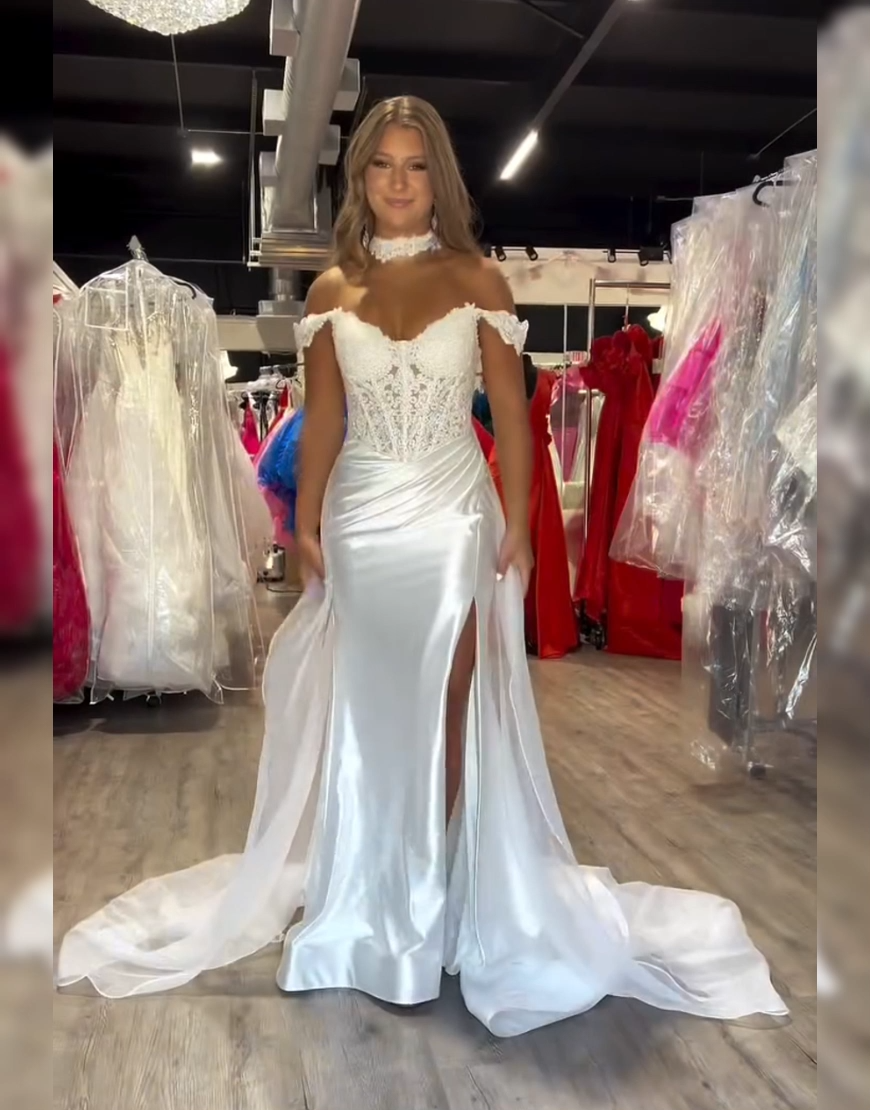 White Off the Shoulder Detachable Cape Mermaid Long Satin Prom Dress with Slit